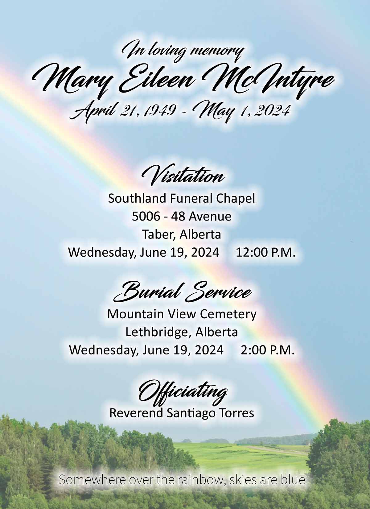 The Burial Service was held at Mountain View Cemetery, 1210 Scenic Drive South, Lethbridge on Wednesday, June 19, 2024 at 2:00 P.M.