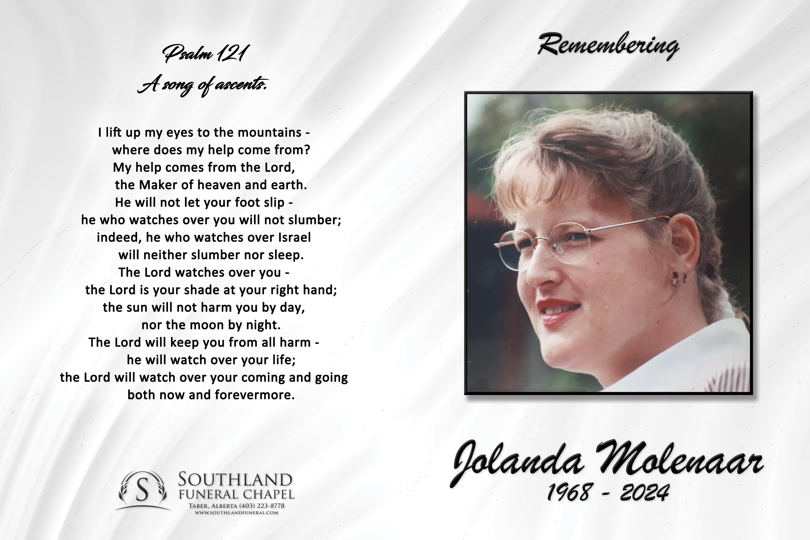 Relatives and friends were invited to meet with the family at Southland Funeral Chapel, 5006 - 48 Avenue, Taber on Wednesday, June 19, 2024 between 7:00 P.M. and 8:00 P.M.