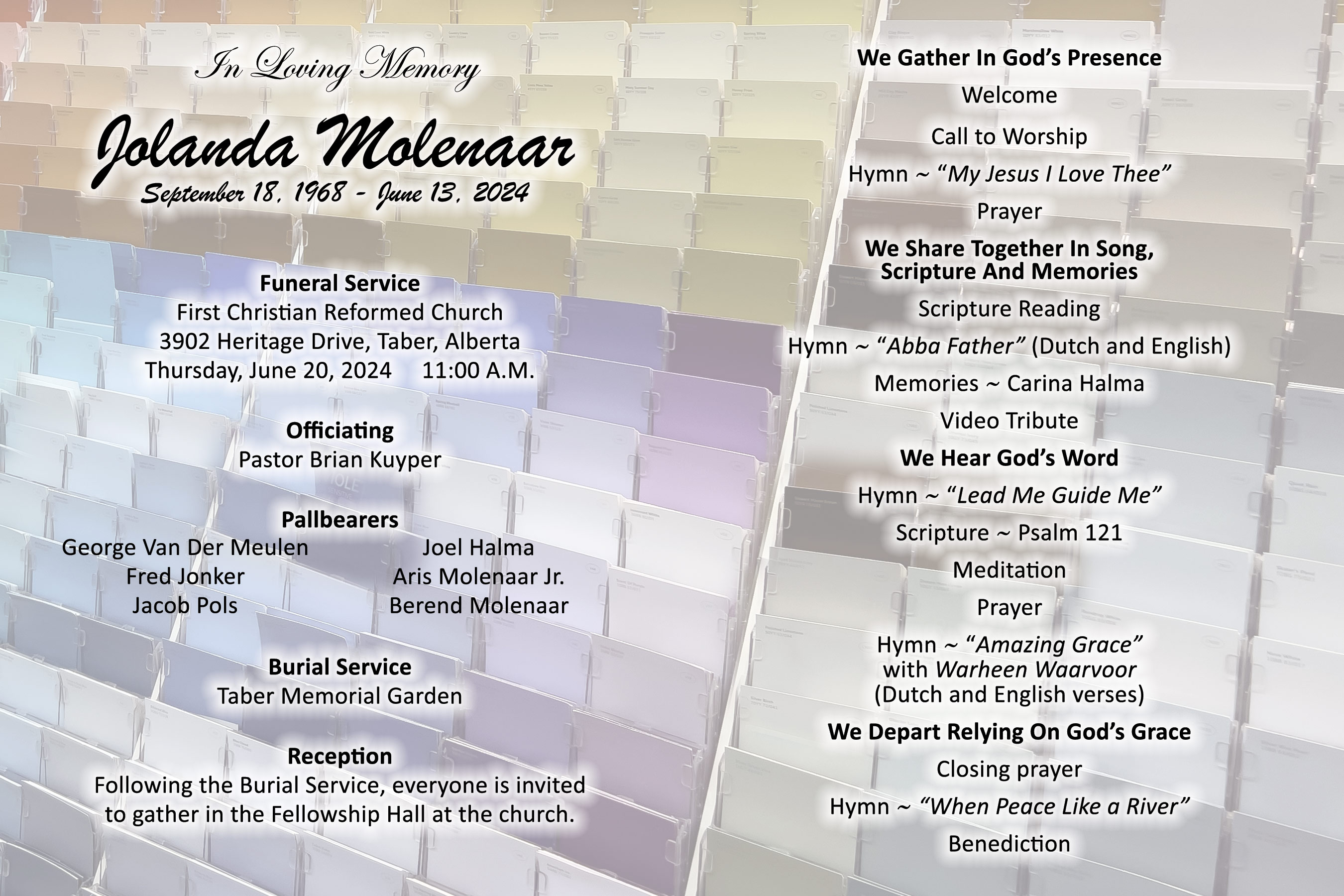 The Funeral Service was held at the First Christian Reformed Church, 3902 Heritage Drive, Taber on Thursday, June 20, 2024 at 11:00 A.M. Burial followed at the Taber Memorial Garden.