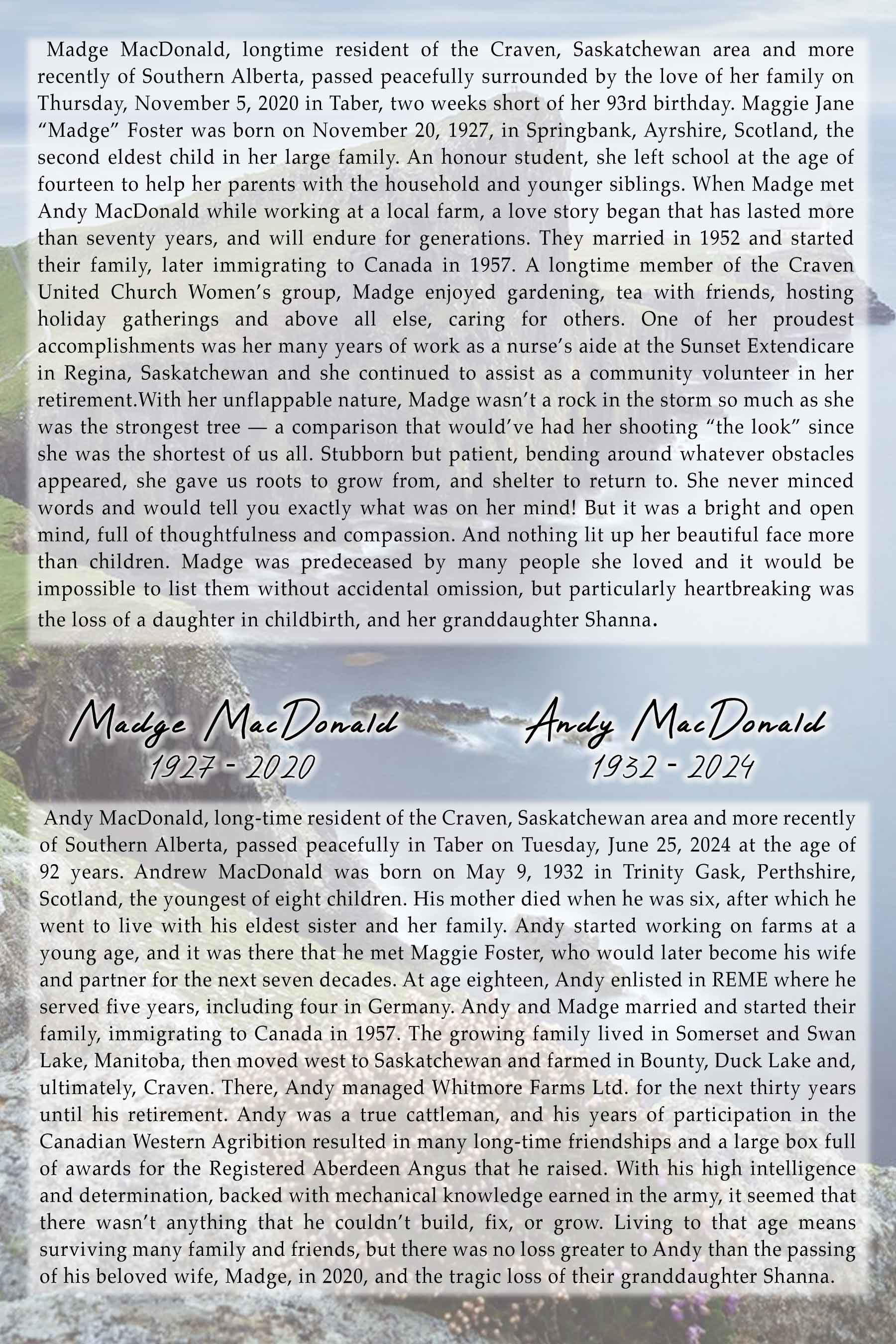 Andy MacDonald, long-time resident of the Craven, Saskatchewan area and more recently of Southern Alberta, passed peacefully in Taber on Tuesday, June 25, 2024 at the age of 92 years.