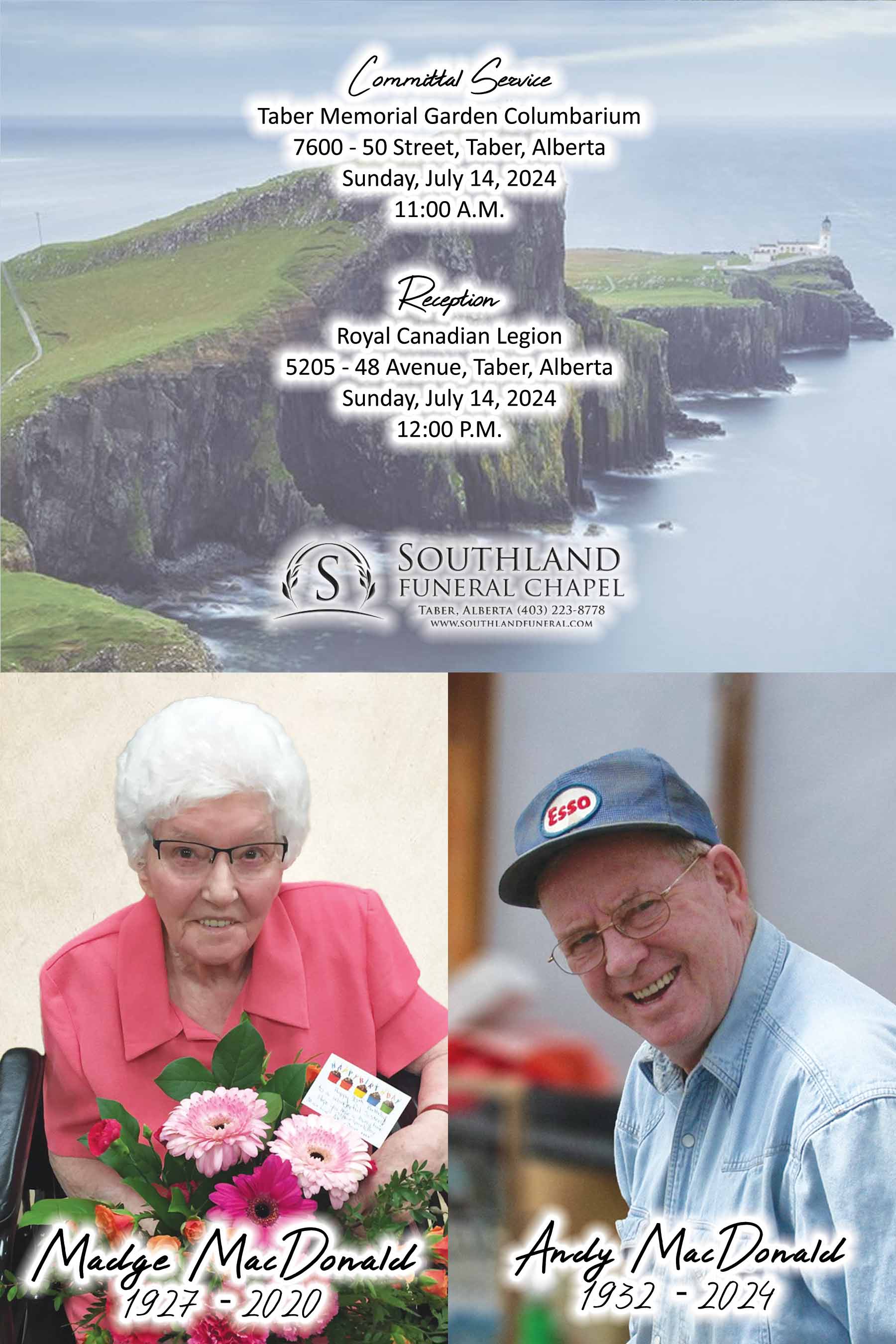 Relatives and friends were invited to attend the committal service that was held at the Taber Memorial Garden, 7600 - 50 Street, Taber on Sunday, July 14, 2024 at 11:00 A.M., followed by a gathering in the lower lounge at the Royal Canadian Legion, 5205 - 48 Avenue, Taber.