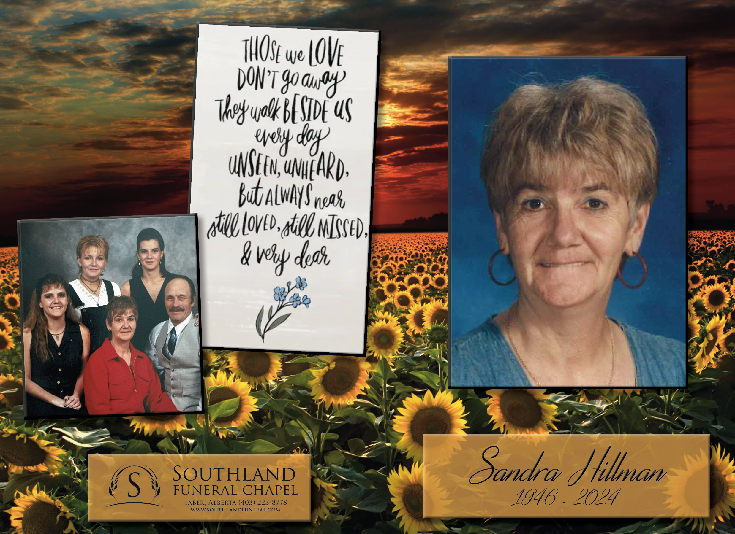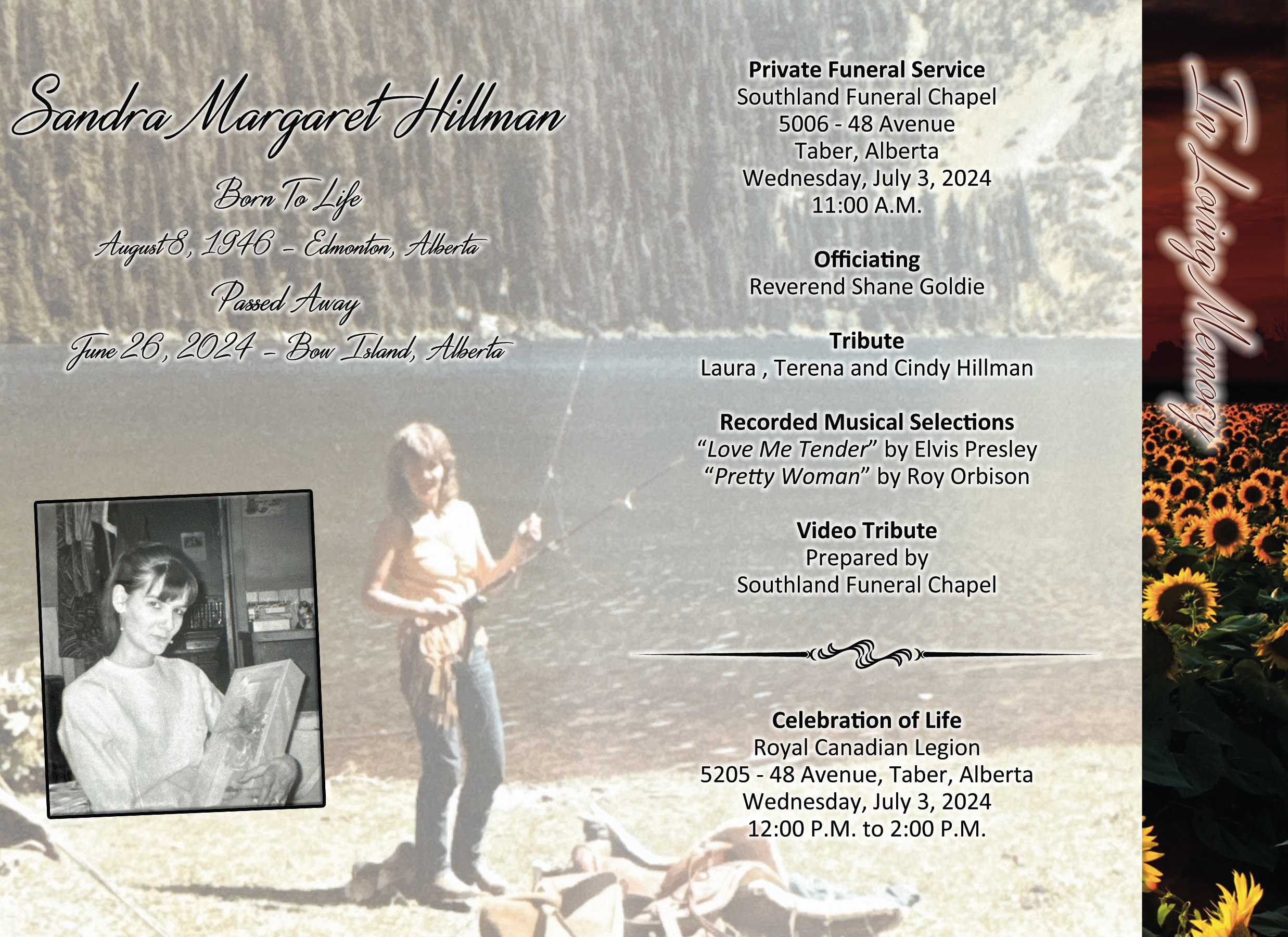 A private funeral service was held at Southland Funeral Chapel, Taber on Wednesday, July 3, 2024 at 11:00 A.M.