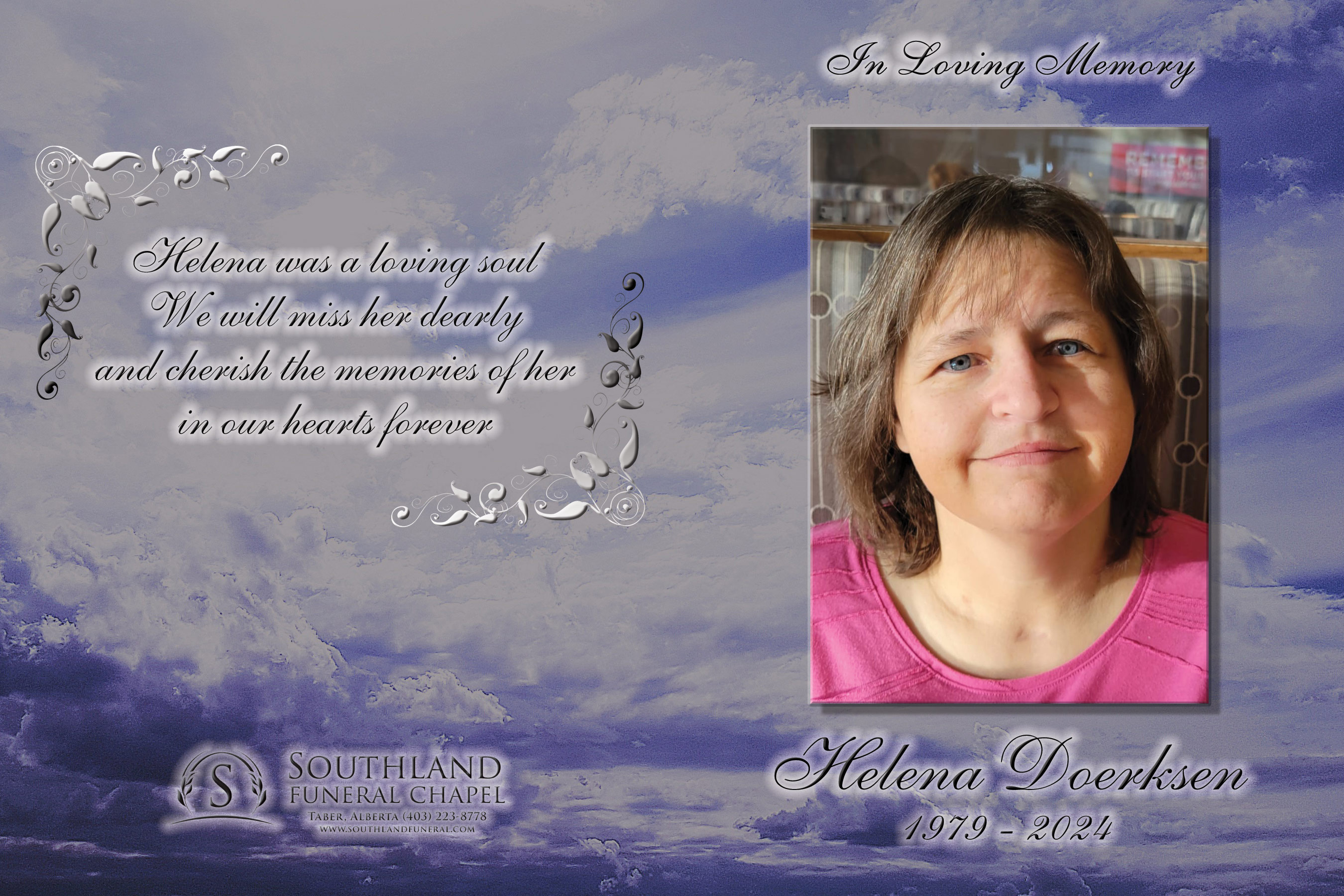 Helena Remple Doerksen, beloved wife of Frank Doerksen, passed away in Lethbridge on Monday, July 8, 2024 at the age of 44 years, a result of heart failure.