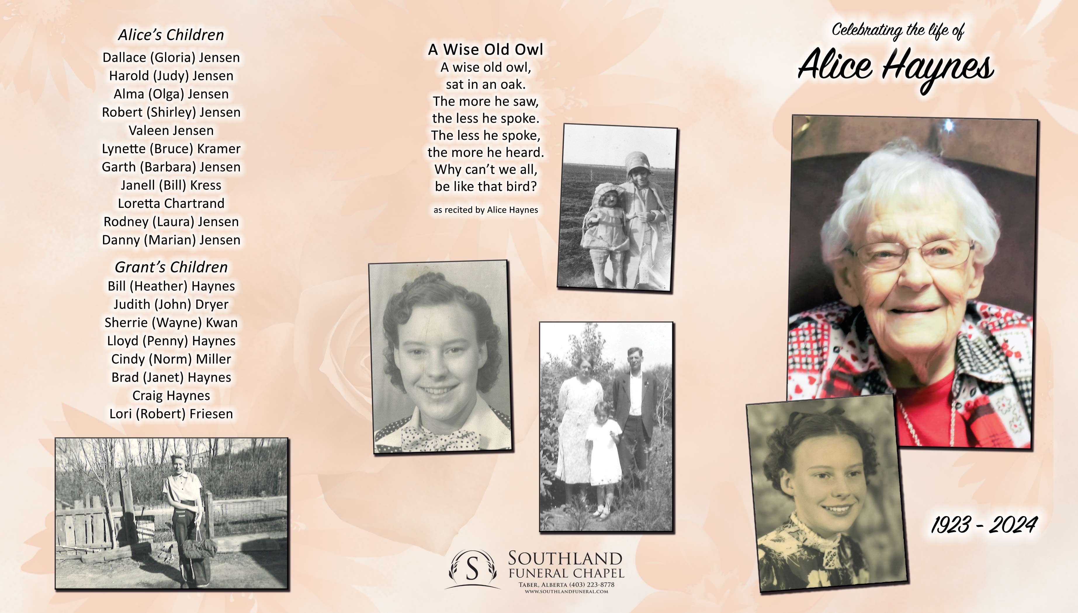Alice is survived by her children Dallace (Gloria) Jensen, Harold (Judy) Jensen, Alma (Olga) Jensen, Robert (Shirley) Jensen, Valeen Jensen, Lynette (Bruce) Kramer, Garth (Barbara) Jensen, Janell (Bill) Kress, Loretta Chartrand, Rodney (Laura) Jensen and Danny (Marian) Jensen and by her grandchildren, great grandchildren and great great grandchildren. She is also survived by her brothers Laurence Anderson, Walter Harris and by Grant’s children William (Heather) Haynes, Judith Dreyer, Sherrie Kwan, Lloyd (Penny) Haynes, Cindy (Norm) Miller, Brad (Jan) Haynes and Lori (Rob) Friesen.