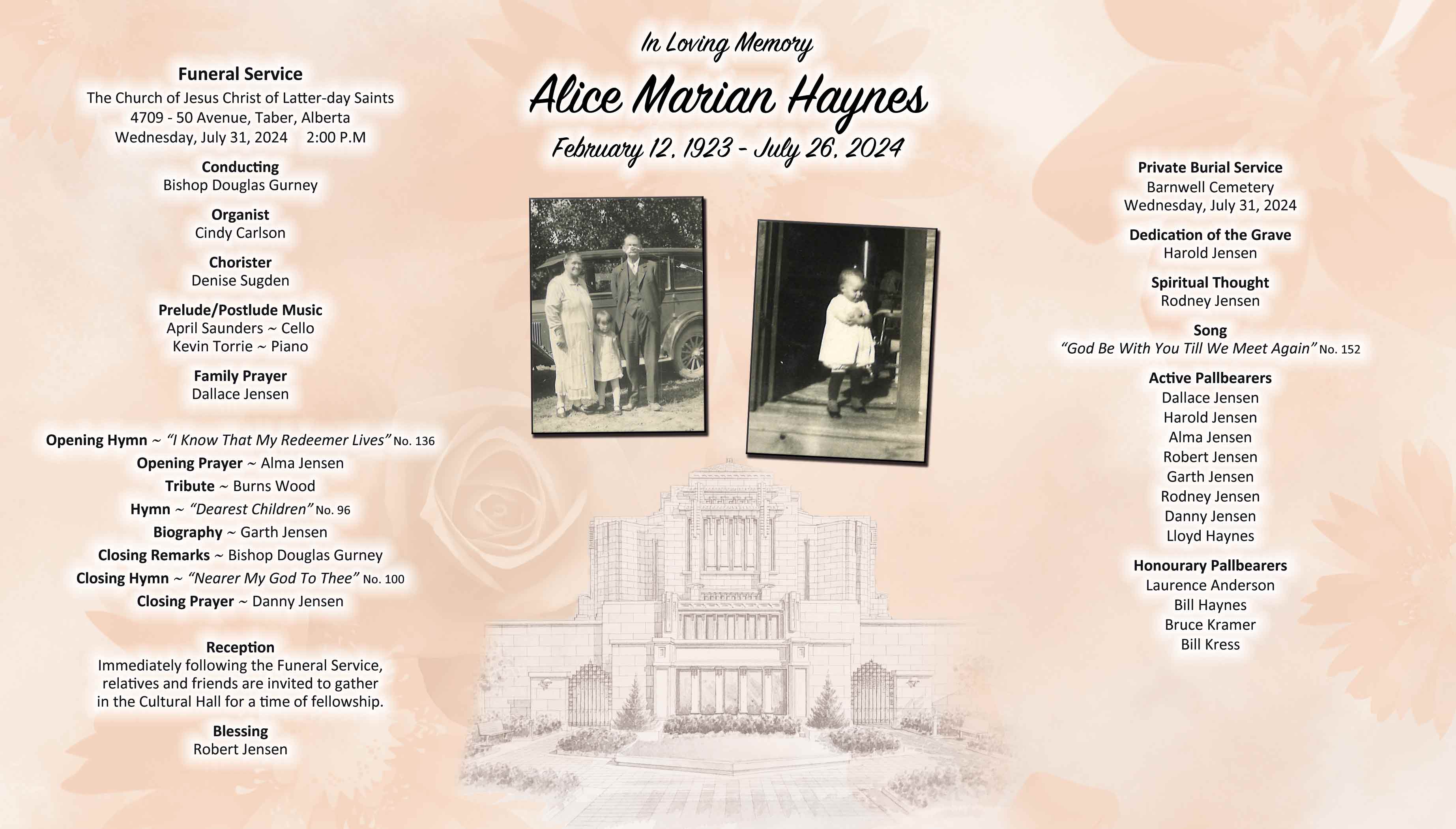 The Funeral Service was held at The Church of Jesus Christ of Latter-day Saints, Taber Stake Centre, 4709 - 50 Avenue, Taber on Wednesday, July 31, 2024 at 2:00 P.M. A private burial followed at the Barnwell Cemetery.