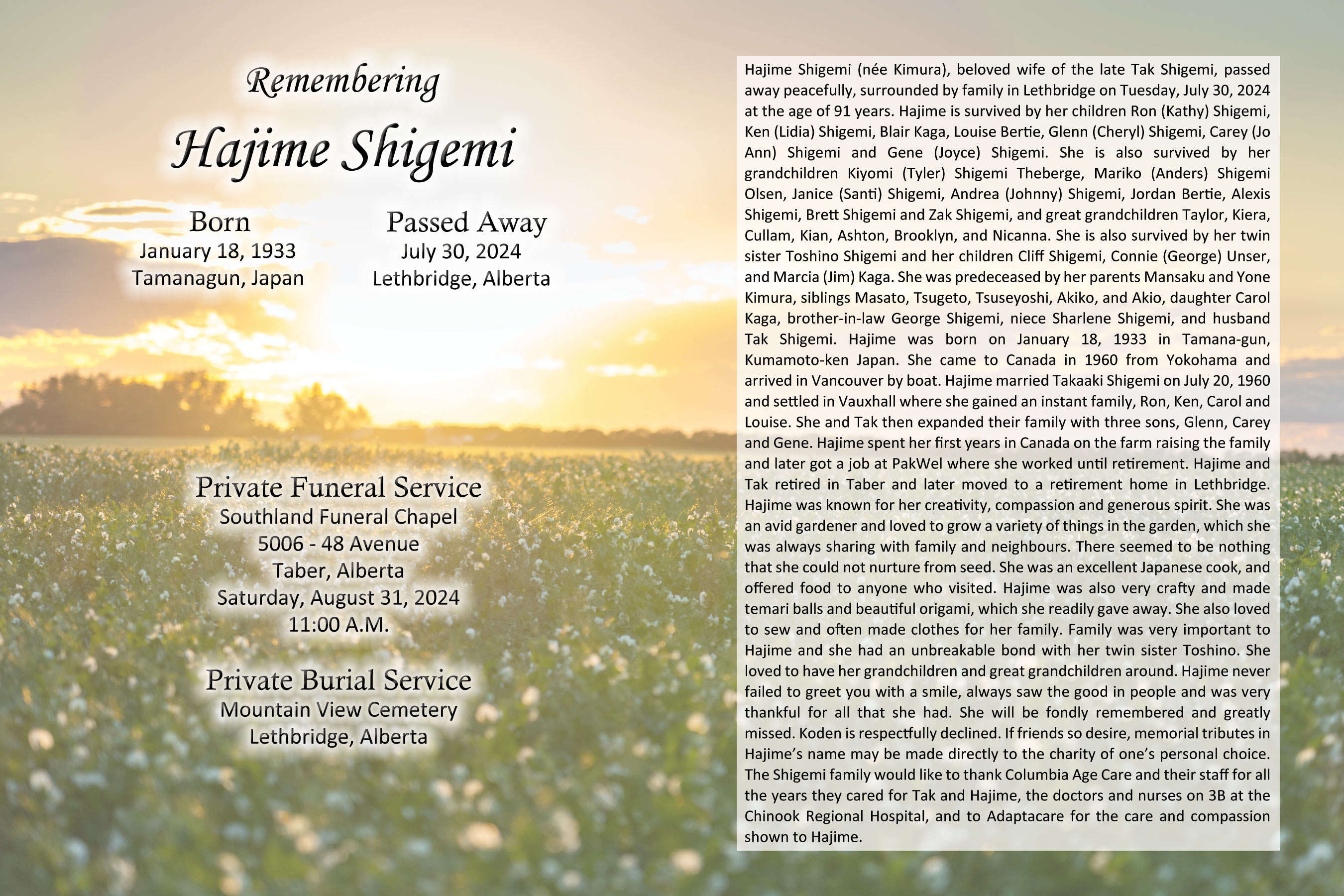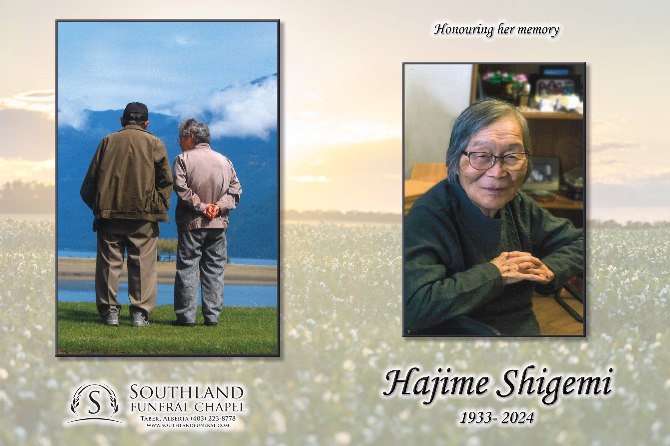 Hajime Shigemi (née Kimura), beloved wife of the late Tak Shigemi, passed away peacefully, surrounded by family in Lethbridge on Tuesday, July 30, 2024 at the age of 91 years.