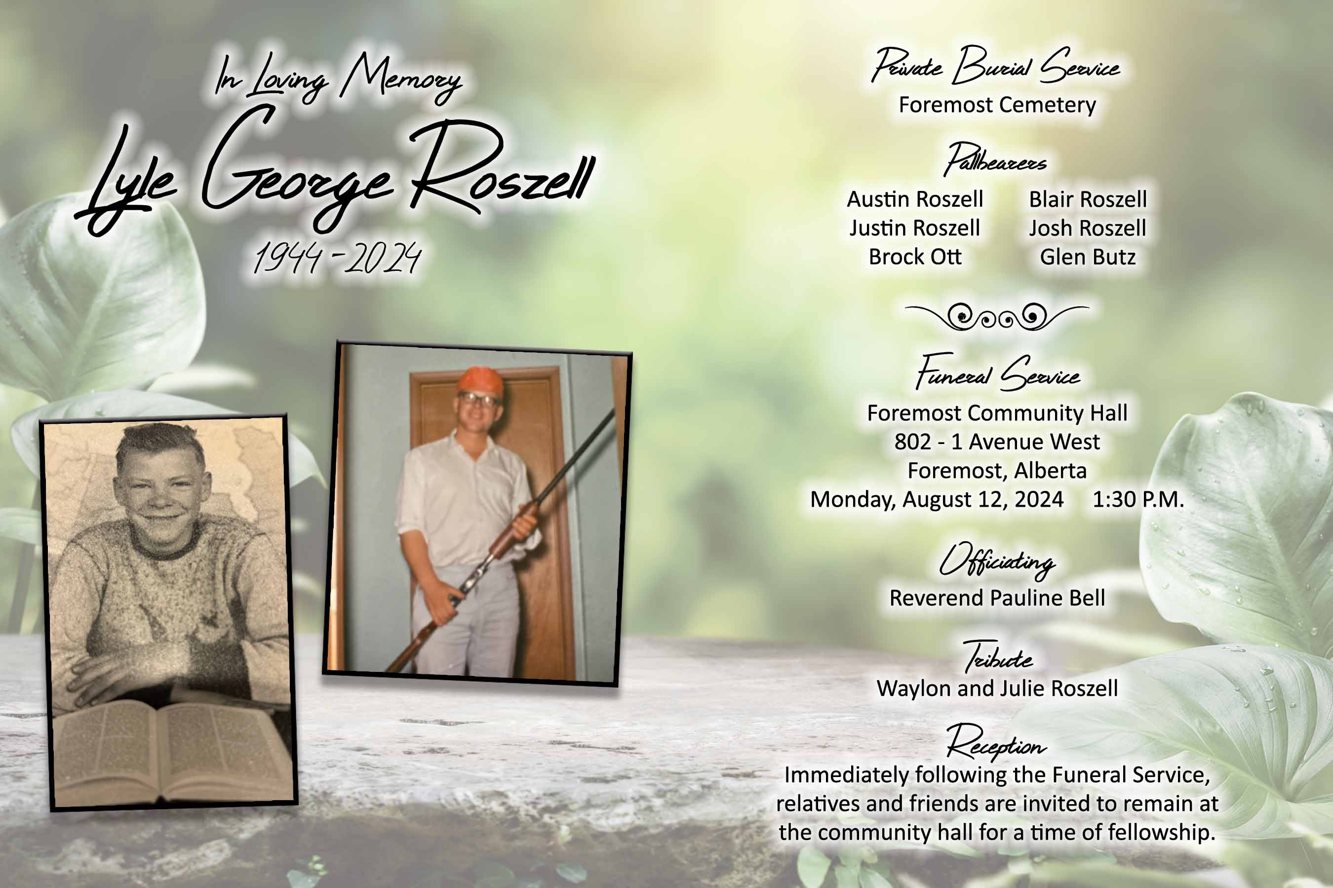 Lyle George Roszell, beloved husband of Elsie Roszell of Foremost, passed away peacefully at the Bow Island Health Centre on Wednesday, August 7, 2024 at the age of 80 years.