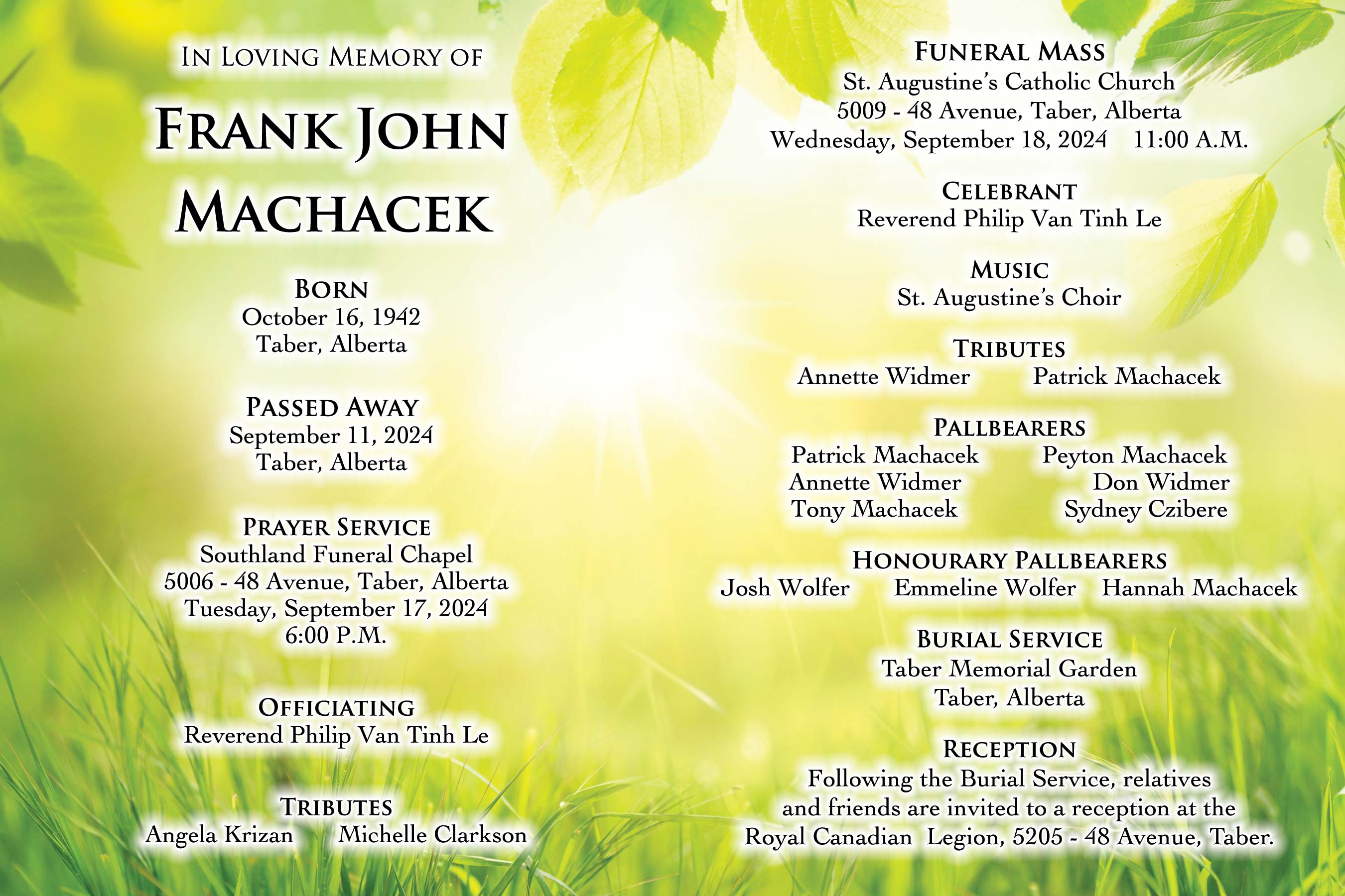 The Funeral Mass was celebrated at St. Augustine's Catholic Church, 5009 - 48 Avenue, Taber on Wednesday, September 18, 2024 at 11:00 A.M. Burial followed at the Taber Memorial Garden.