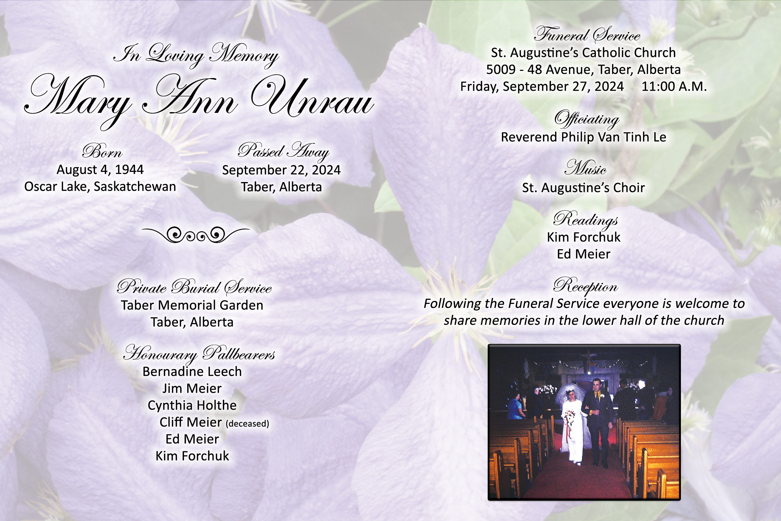 The Funeral Service was held at St. Augustine’s Catholic Church, 5009 - 48 Avenue, Taber on Friday, September 27, 2024 at 11:00 A.M.