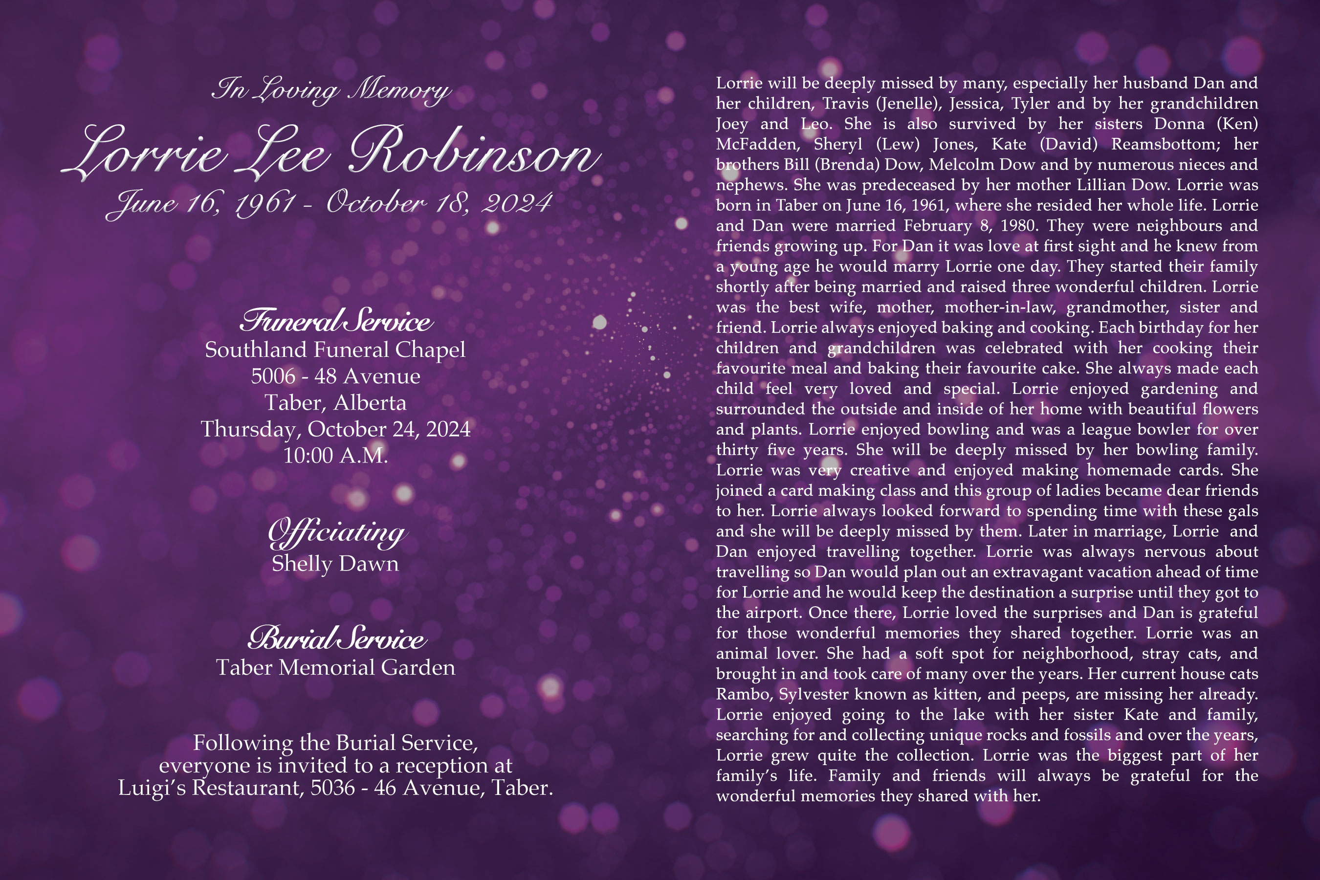 The Funeral Service was held at Southland Funeral Chapel, 5006 - 48 Avenue on Thursday, October 24, 2024 at 10:00 A.M. with Life Celebrant Shelly Bassett officiating. Burial followed at Taber Memorial Garden.