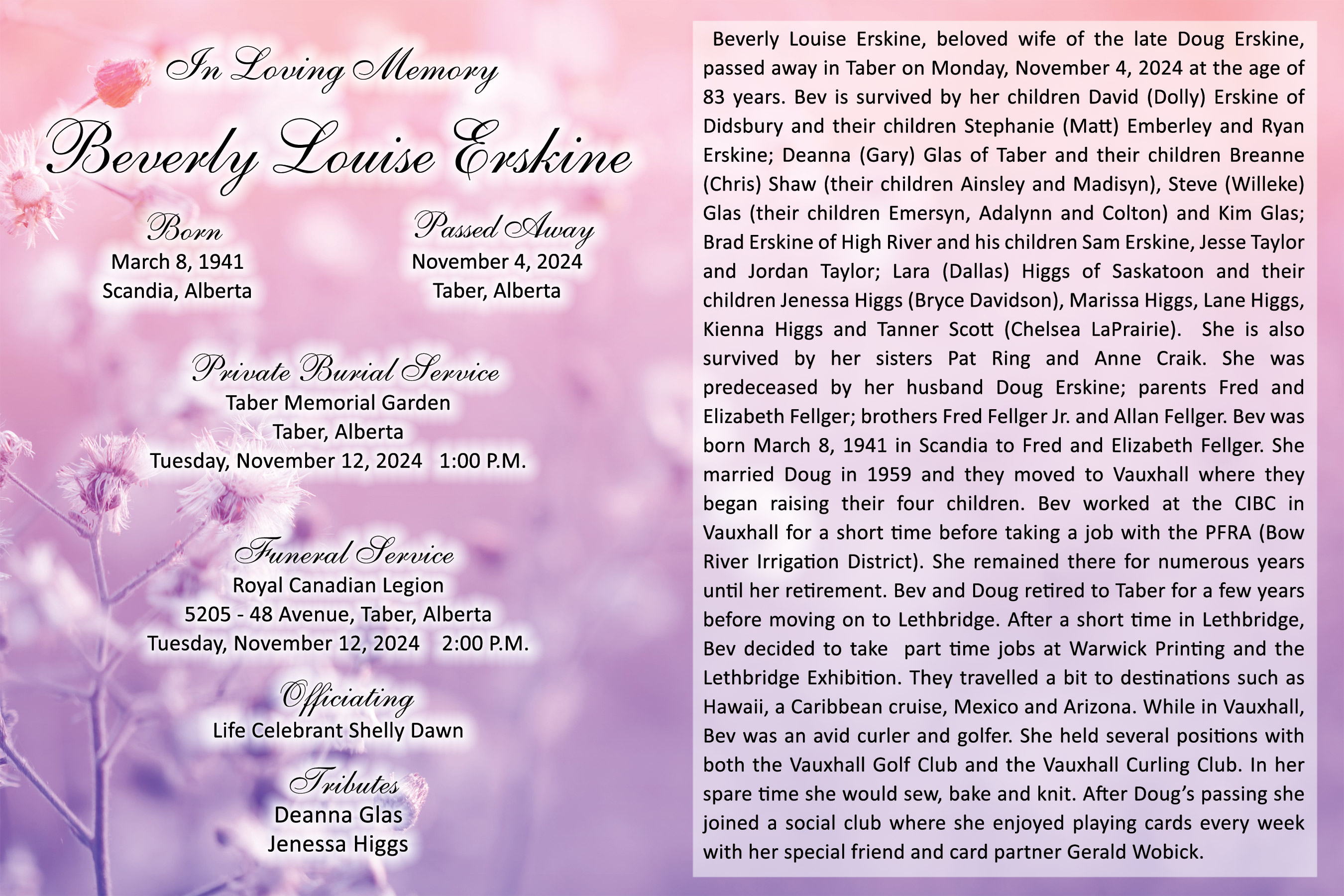 Relatives and friends were invited to celebrate Bev’s life at the Royal Canadian Legion, 5205 - 48 Avenue, Taber on Tuesday, November 12, 2024 at 2:00 P.M with Life Celebrant Shelly Bassett officiating.