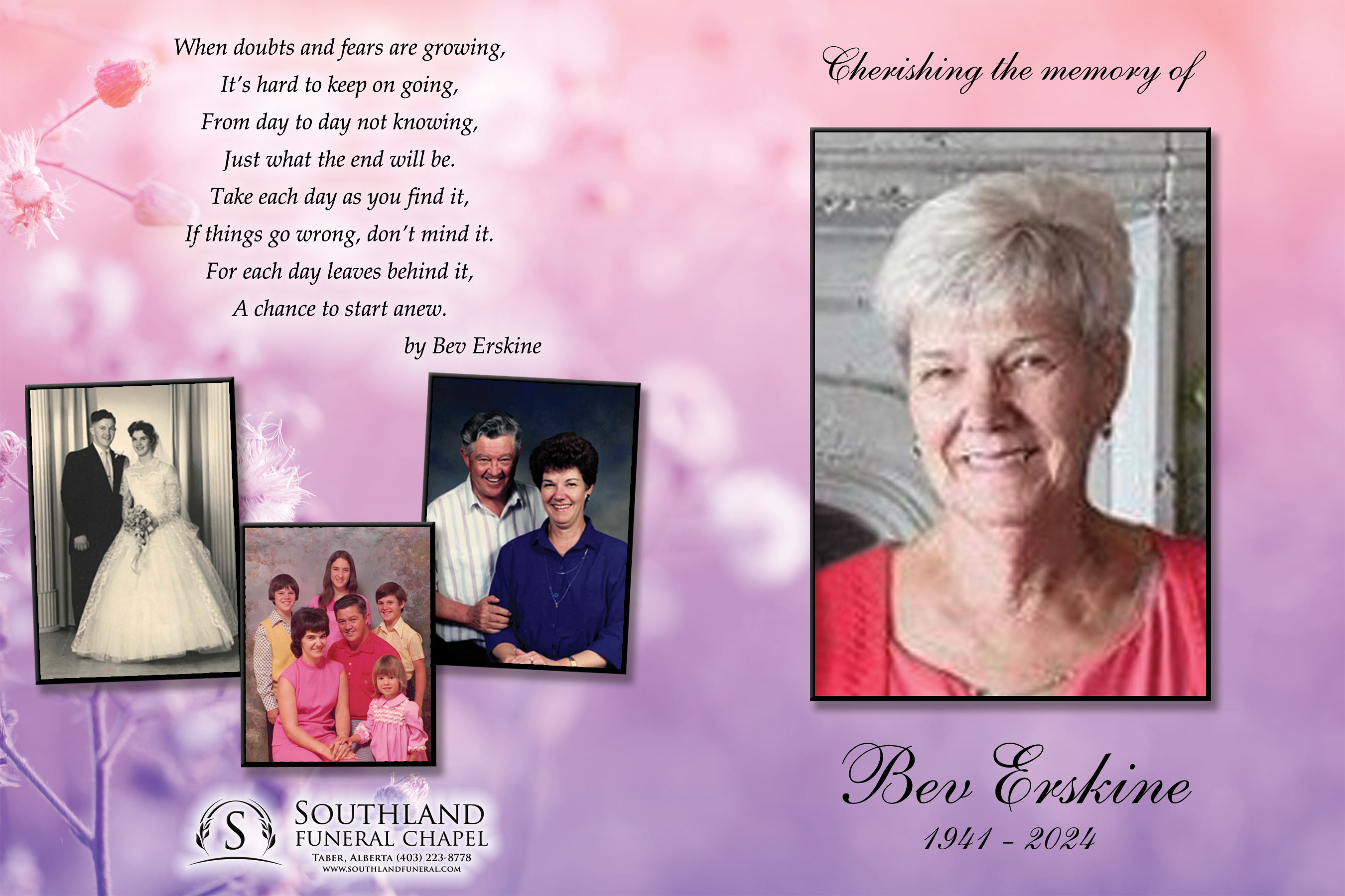 Bev is survived by her children David (Dolly) Erskine of Didsbury and their children Stephanie (Matt) Emberley and Ryan Erskine; Deanna (Gary) Glas of Taber and their children Breanne (Chris) Shaw (their children Ainsley and Madisyn), Steve (Willeke) Glas (their children Emersyn, Adalynn and Colton) and Kim Glas; Brad Erskine of High River and his children Sam Erskine, Jesse Taylor and Jordan Taylor; Lara (Dallas) Higgs of Saskatoon and their children Jenessa Higgs (Bryce Davidson), Marissa Higgs, Lane Higgs, Kienna Higgs and Tanner Scott (Chelsea LaPrairie). She is also survived by her sisters Pat Ring and Anne Craik.