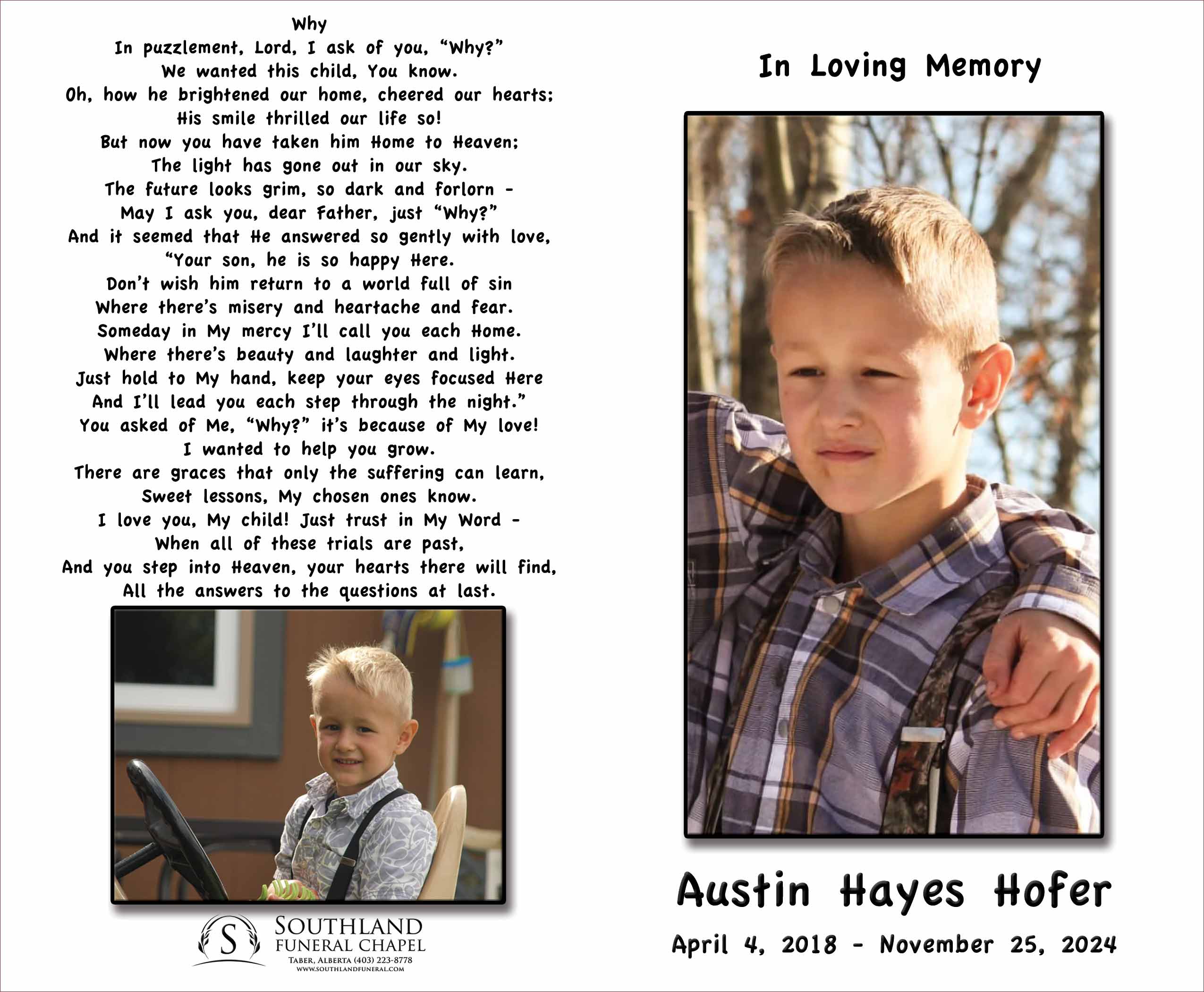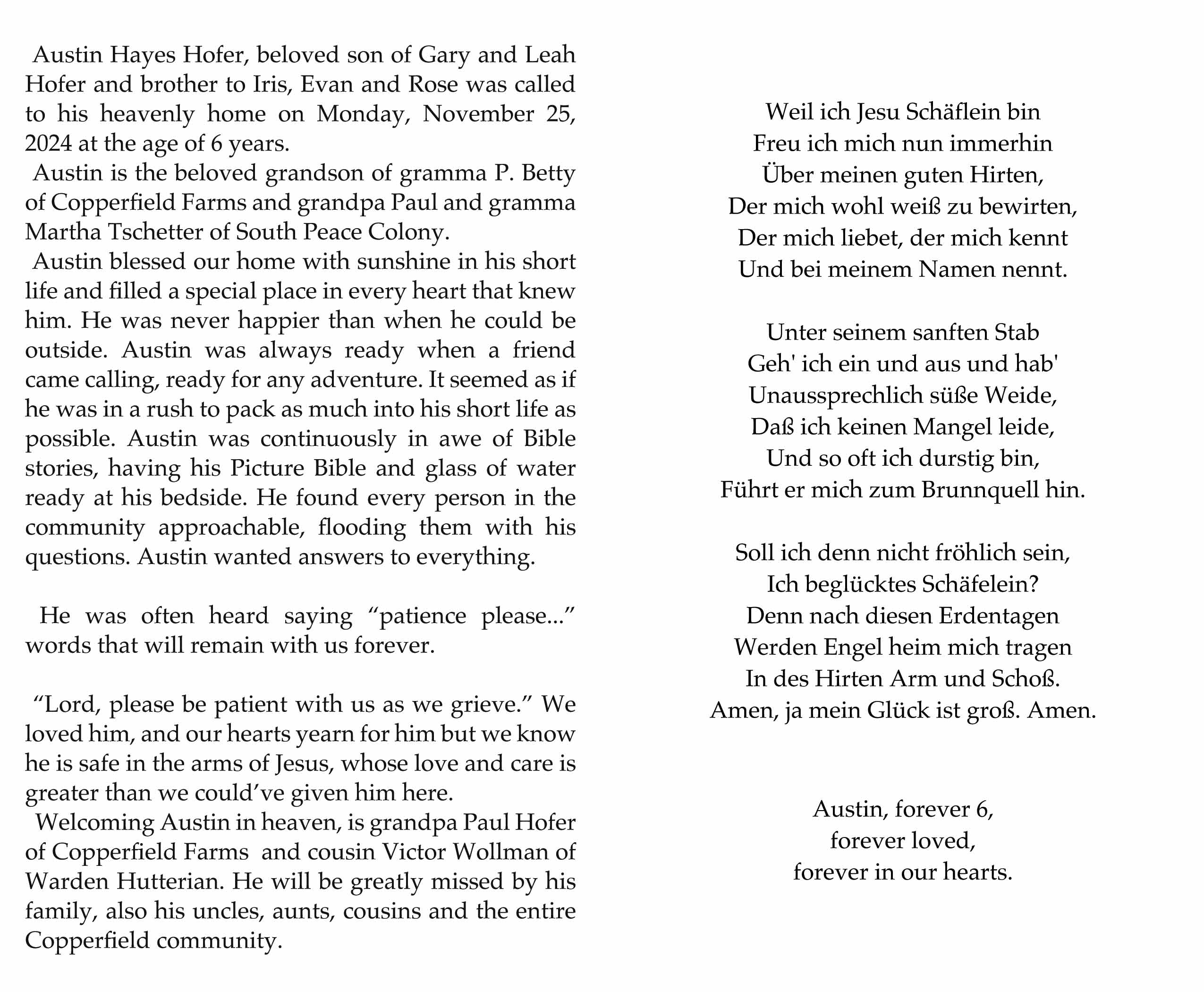 Austin Hayes Hofer, beloved son of Gary and Leah Hofer and brother to Iris, Evan and Rose, was called to his heavenly home on Monday, November 25, 2024 at the age of 6 years.