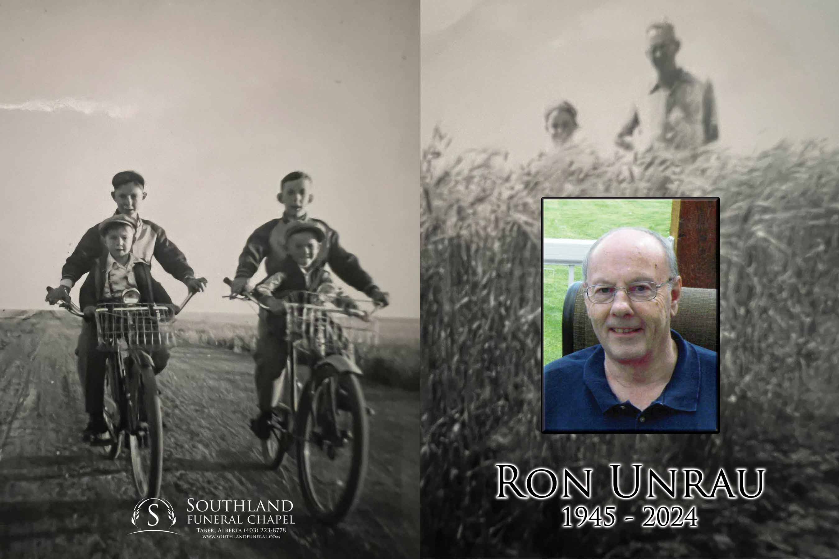 Ron was born in Coaldale on November 29, 1945. He was the youngest of the second set of twins born to John and Helen Unrau. Ron had fond memories of growing up on the family farm in Skiff with his parents, twin brother Don and their older brothers Allan and Bill. This instilled a lifelong interest in farming operations and business.