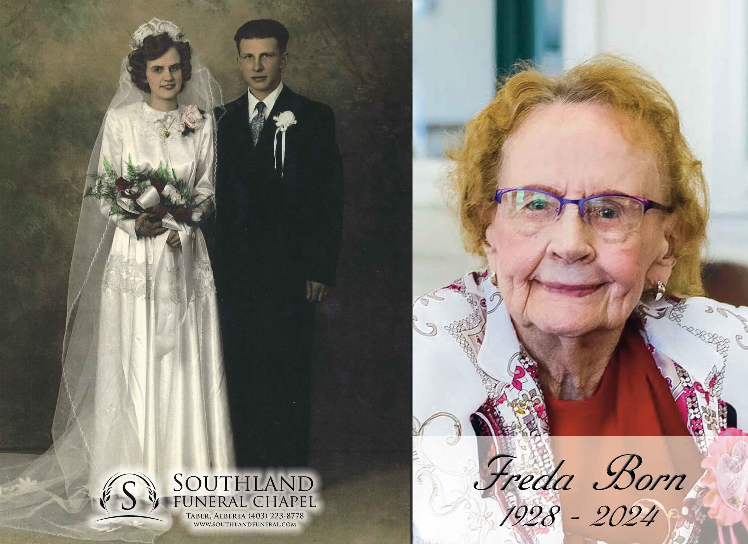 Freda Born, beloved wife of the late Jake Born, passed away in Lethbridge on December 25, 2024 at the age of 96 years.