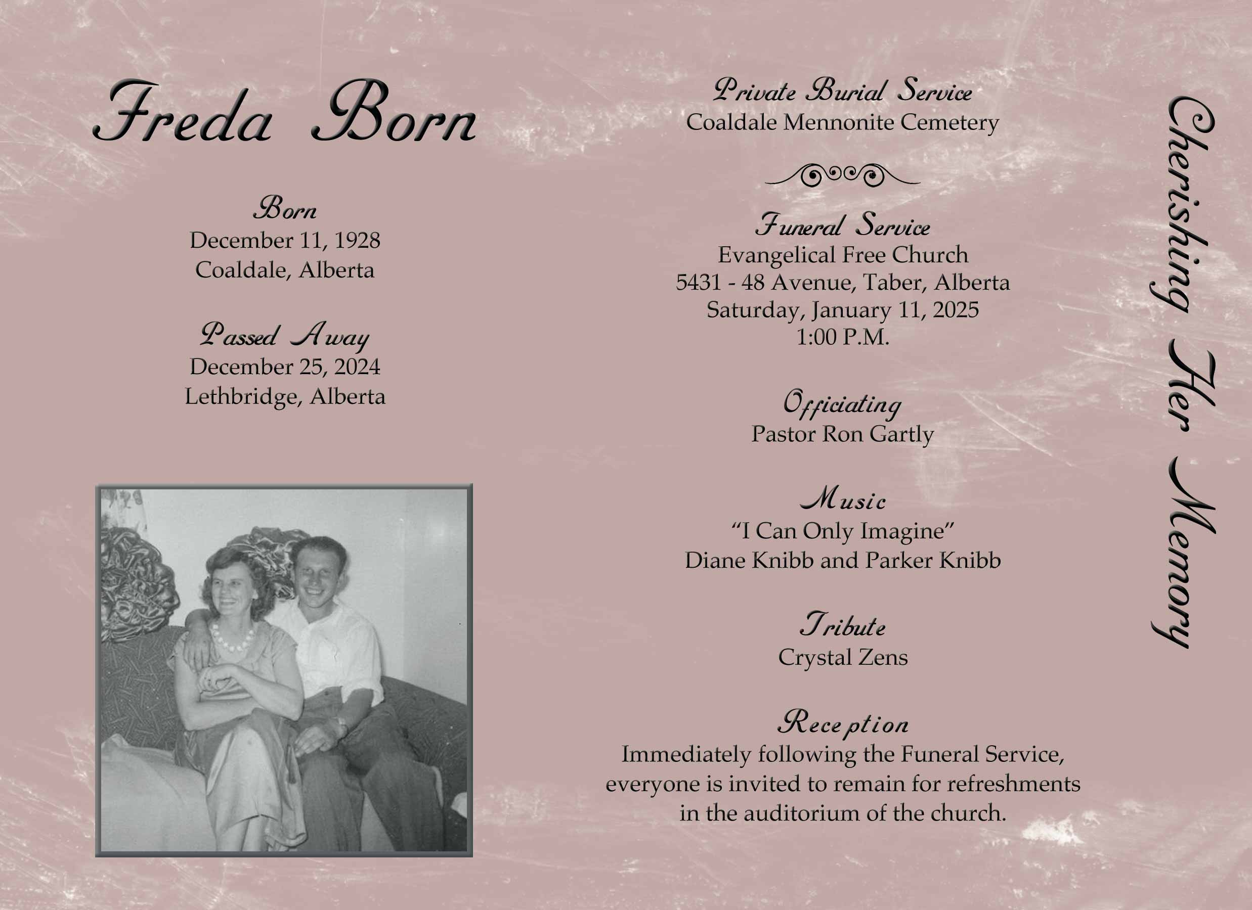 The Funeral Service was held at the Evangelical Free Church, 5431 - 48 Avenue, Taber on Saturday, January 11, 2025 at 1:00 P.M.
