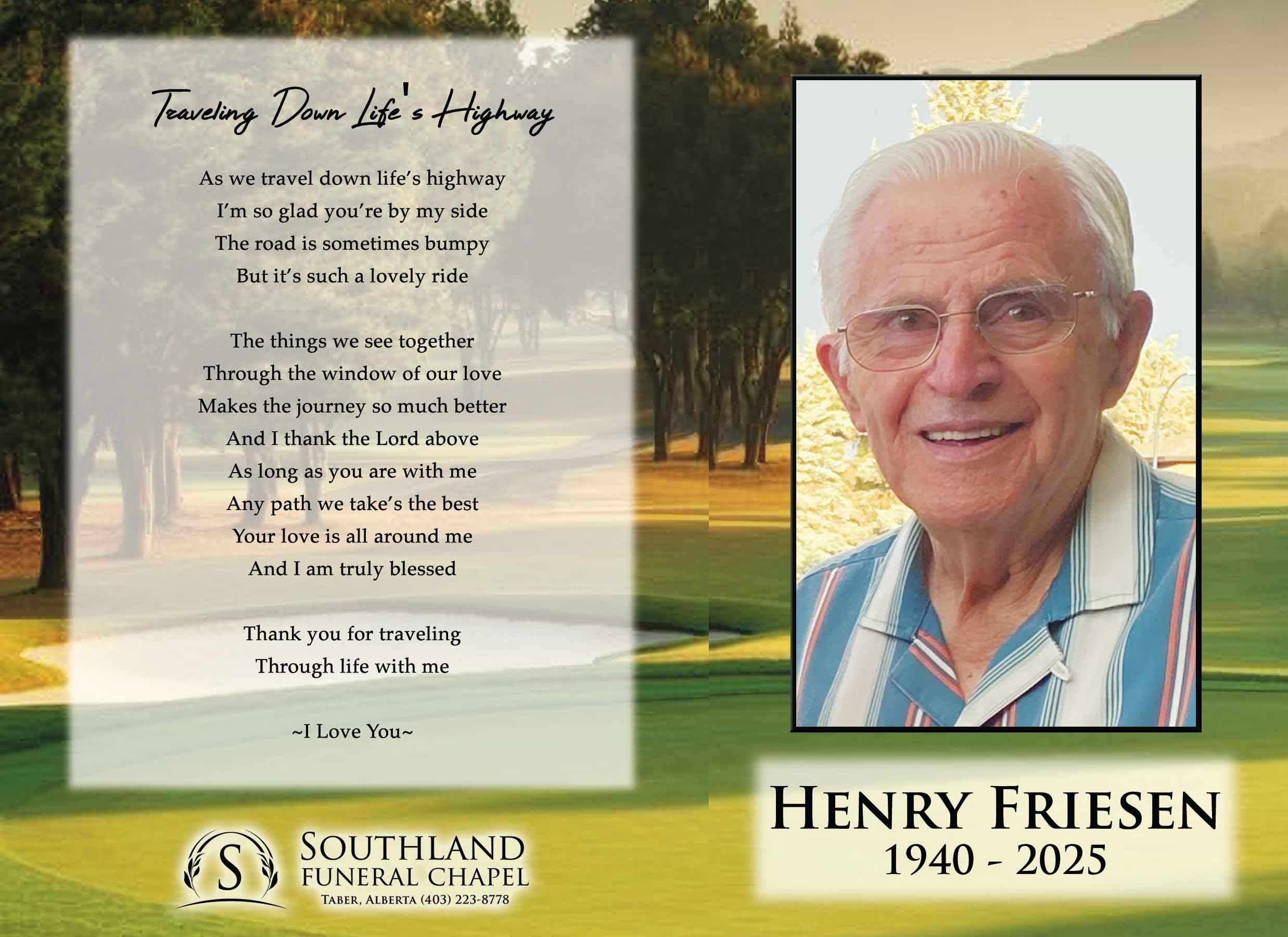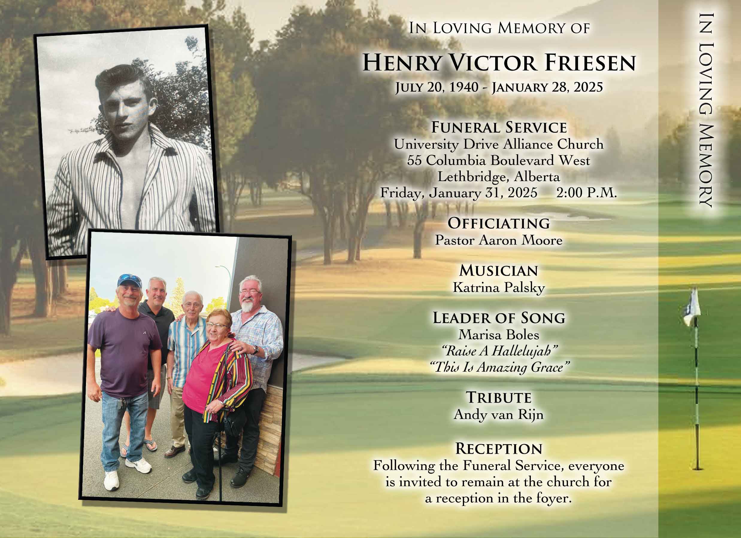Henry Victor Friesen, beloved husband of Darla Friesen, passed away in Lethbridge, surrounded by his family, on Tuesday, January 28, 2025 at the age of 84 years.