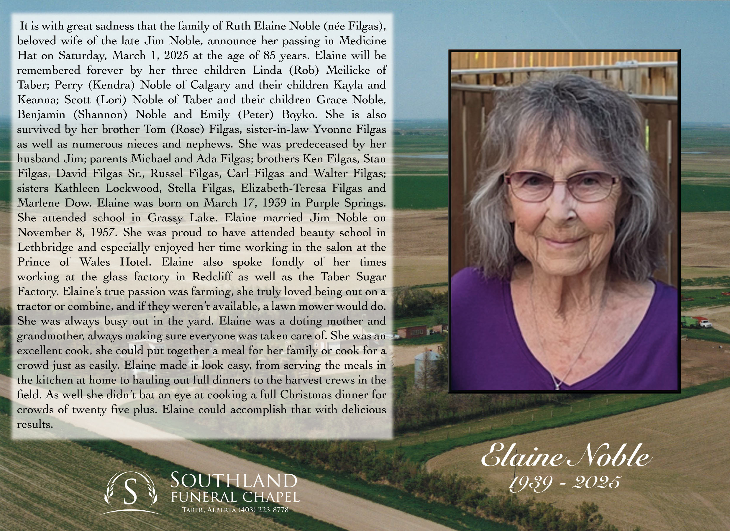 It is with great sadness that the family of Ruth Elaine Noble (née Filgas), beloved wife of the late Jim Noble, announce her passing in Medicine Hat on Saturday, March 1, 2025 at the age of 85 years.