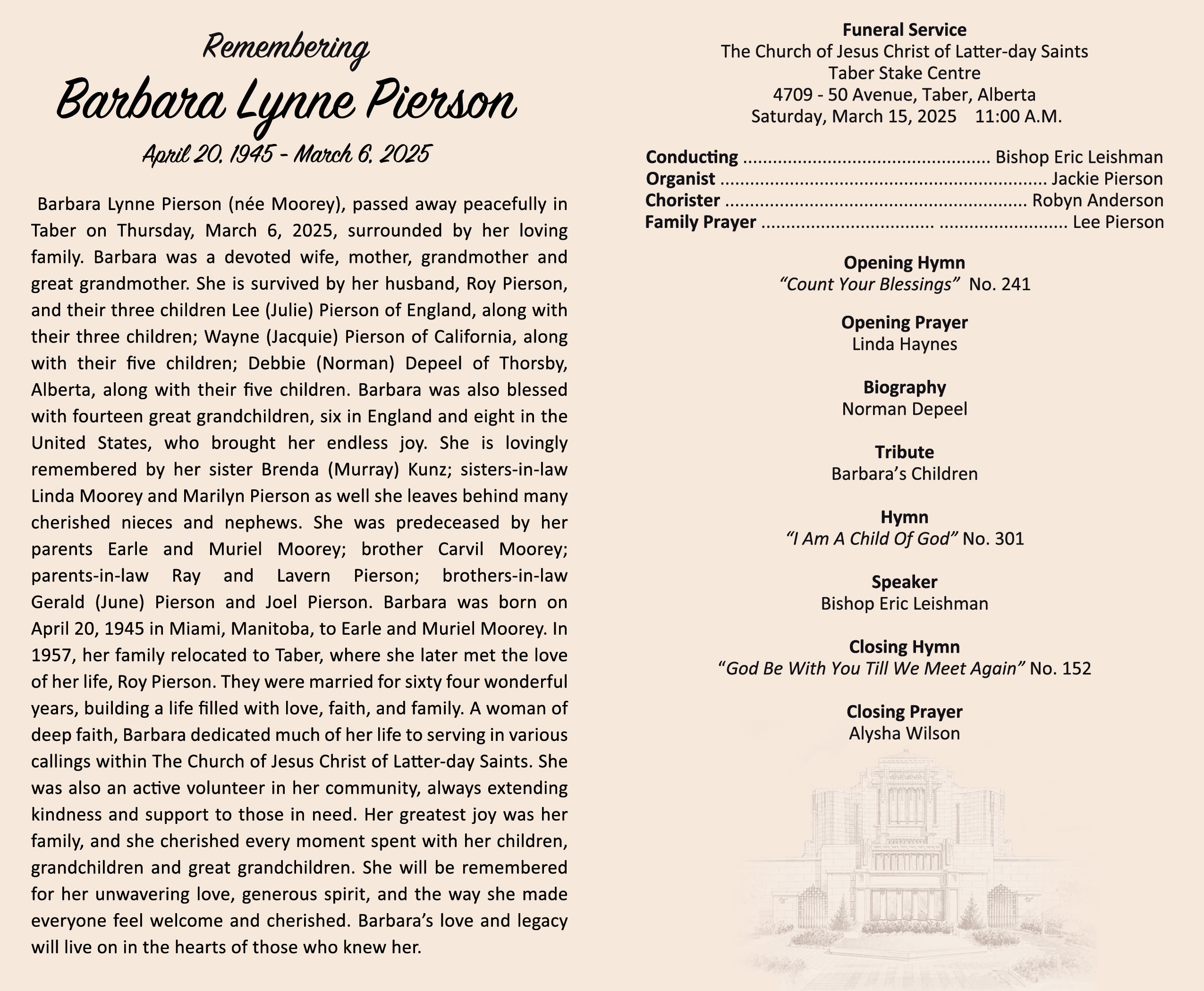 The Funeral Service was held at The Church of Jesus Christ of Latter-day Saints, Taber Stake Centre, 4709 - 50 Avenue, Taber on Saturday, March 15, 2025 at 11:00 A.M.