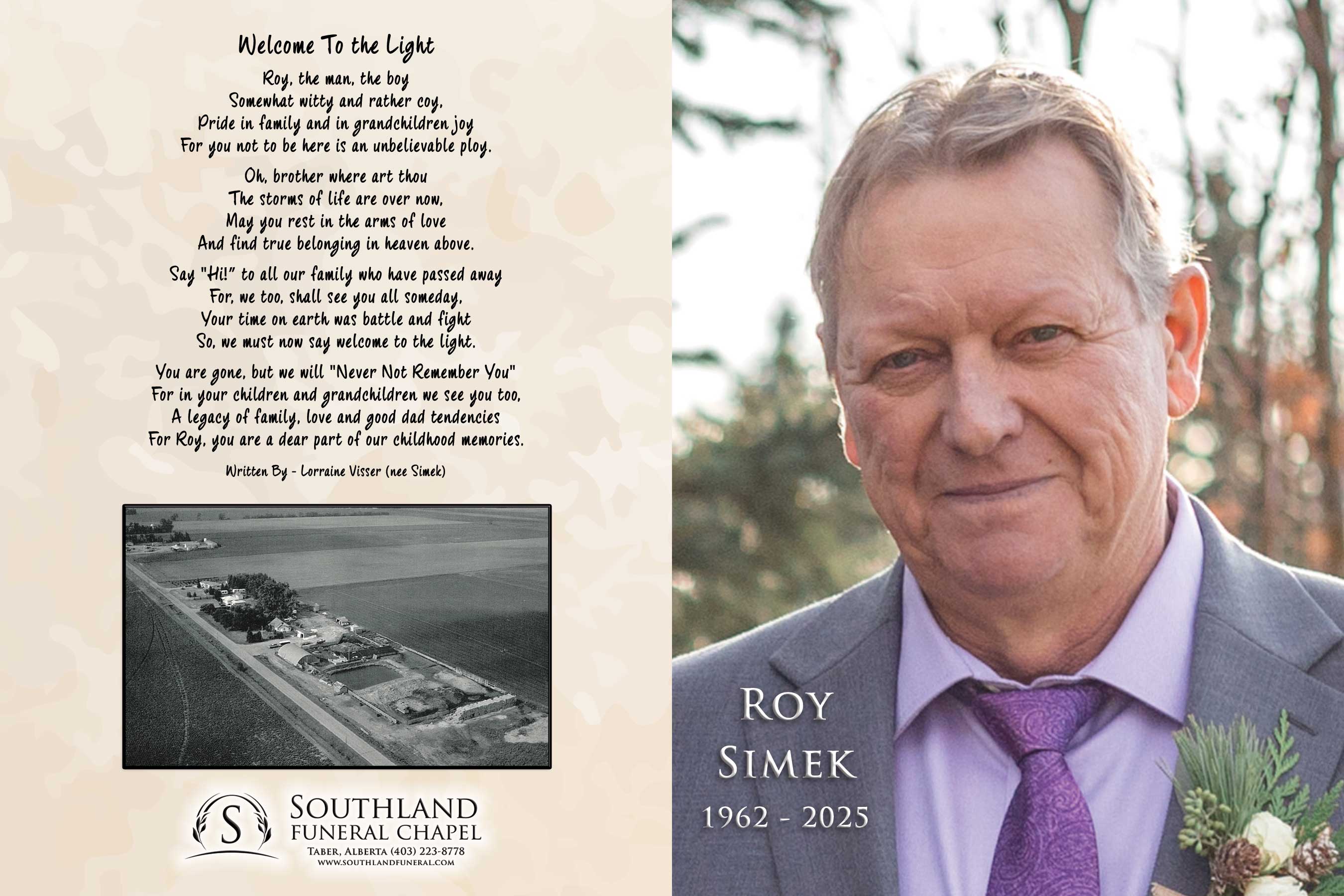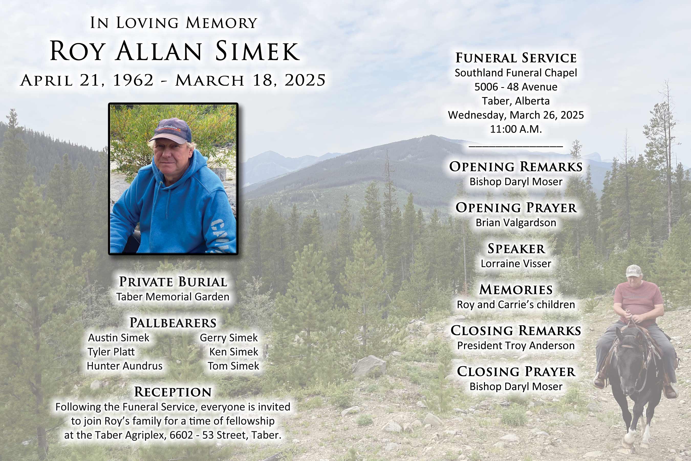 Roy Allan Simek, passed away unexpectedly, but peacefully in Taber on Tuesday, March 18, 2025 at the age of 62 years.