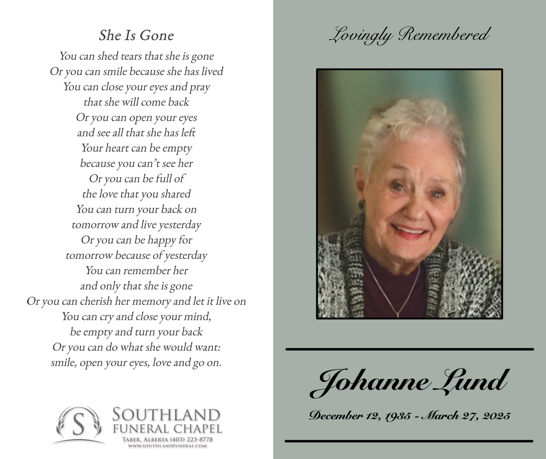 With love and gratitude for a life well lived, we announce the passing of Johanne Sandra Lund, a beloved wife, mother, grandmother, and great grandmother. She passed away peacefully in Taber on Thursday, March 27, 2025 as the sun started its long descent across the prairie sky, which she loved.