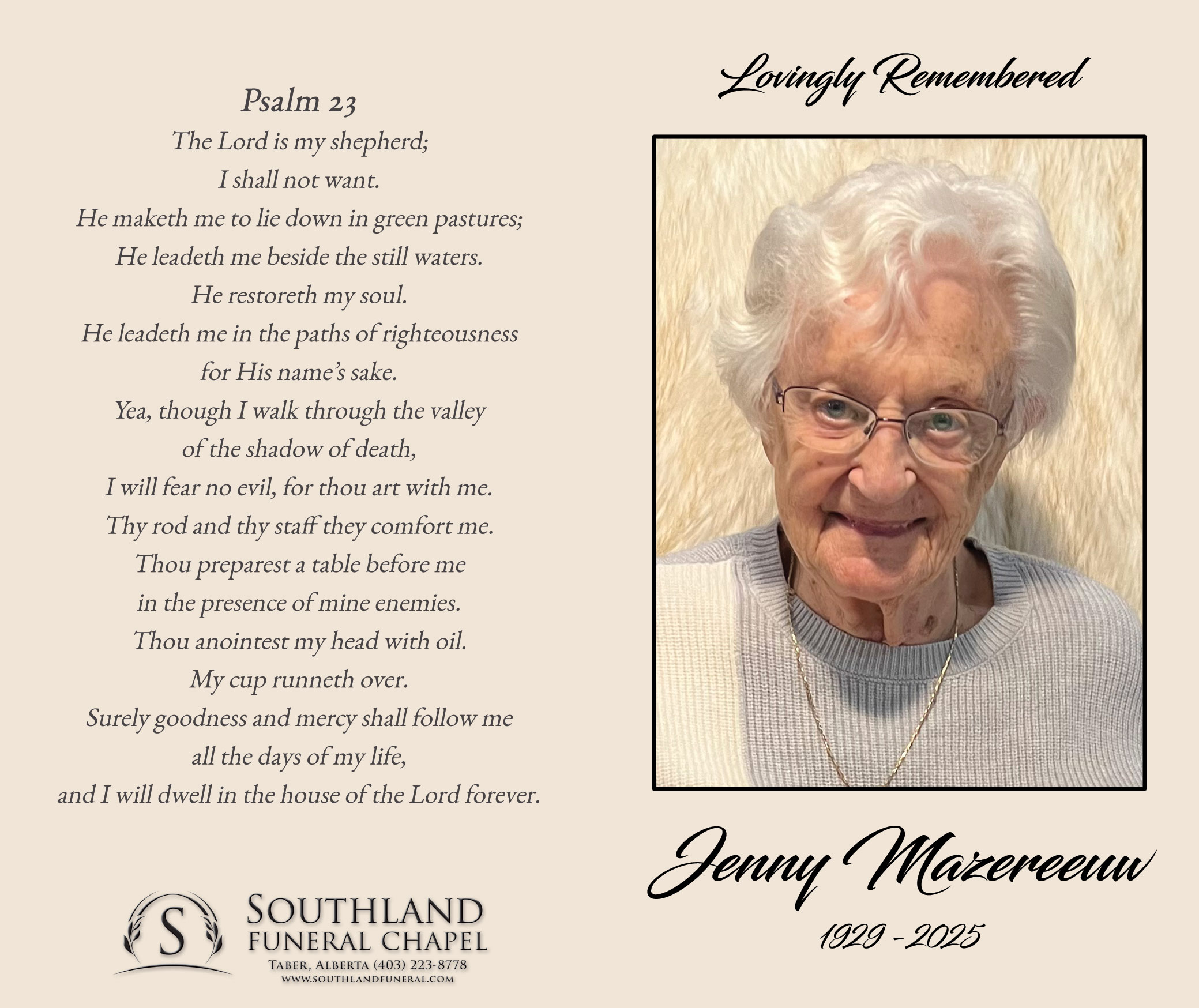 Relatives and friends were invited to meet with the family at Southland Funeral Chapel, 5006 - 48 Avenue, Taber on Thursday, April 3, 2025 between 7:00 P.M. and 8:00 P.M.