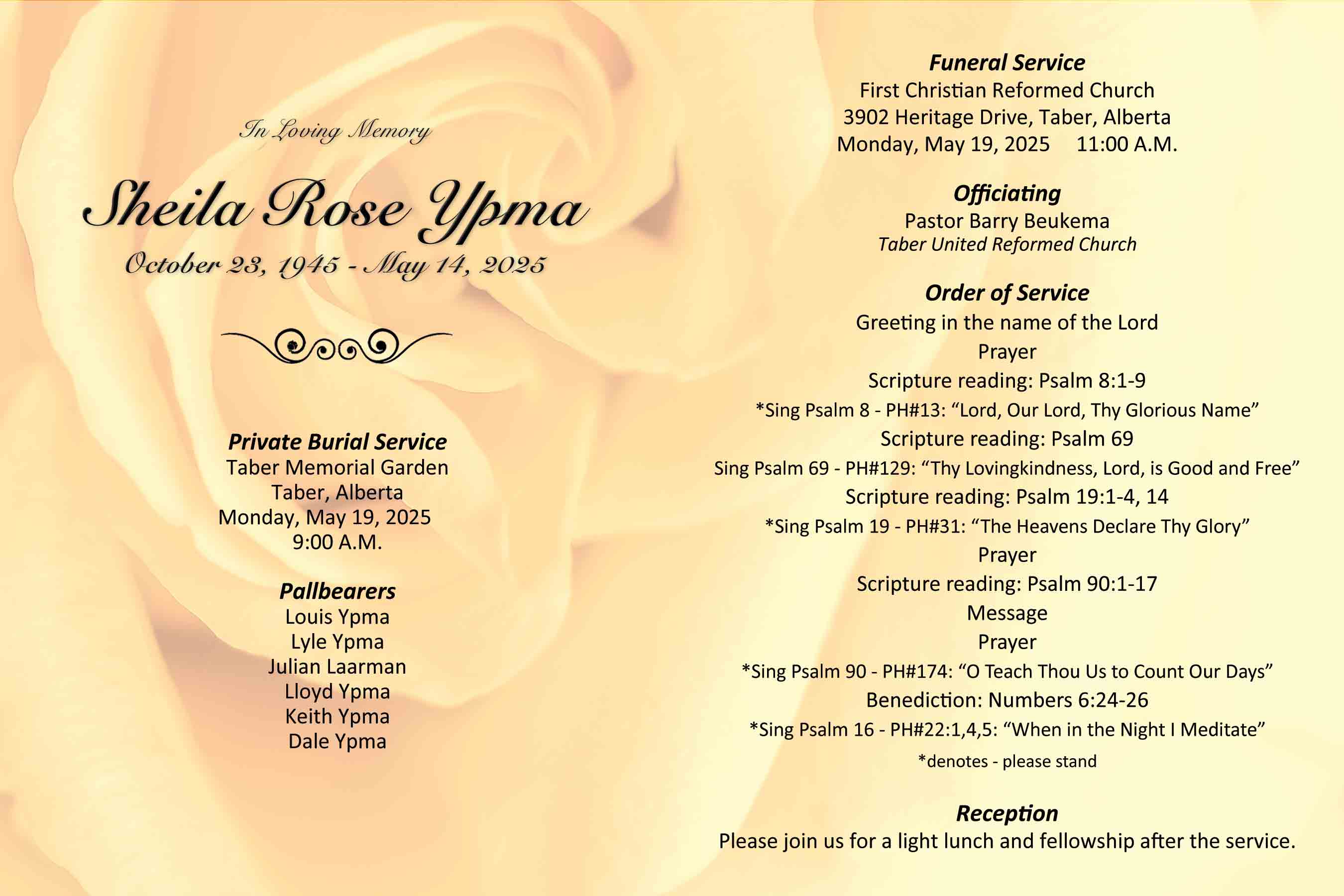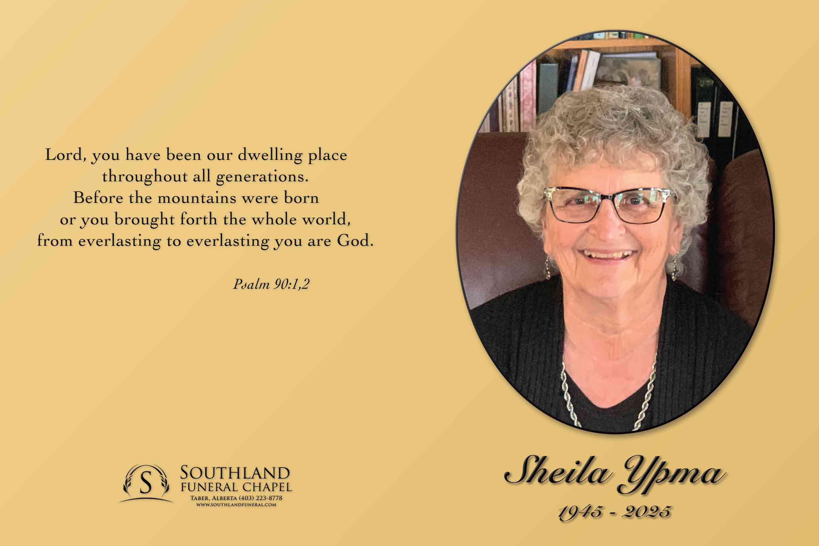 According to the predetermined plan of the sovereign God, Sheila Rose Ypma was taken by the Lord from this earth on Wednesday, May 14, 2025 at the age of 79 years. Sheila was a child of God because of God‘s divine election, whereby even before the earth was founded, God chose for Himself, the children whom He redeemed. Sheila was saved by God’s grace alone, because of the atoning blood of the crucified and resurrected Jesus Christ alone and through the instrument of God given faith alone. Sheila was baptized in the name of God the Father, God the Son and God the Holy Spirit; to Him be all the glory for He alone is the God of salvation.