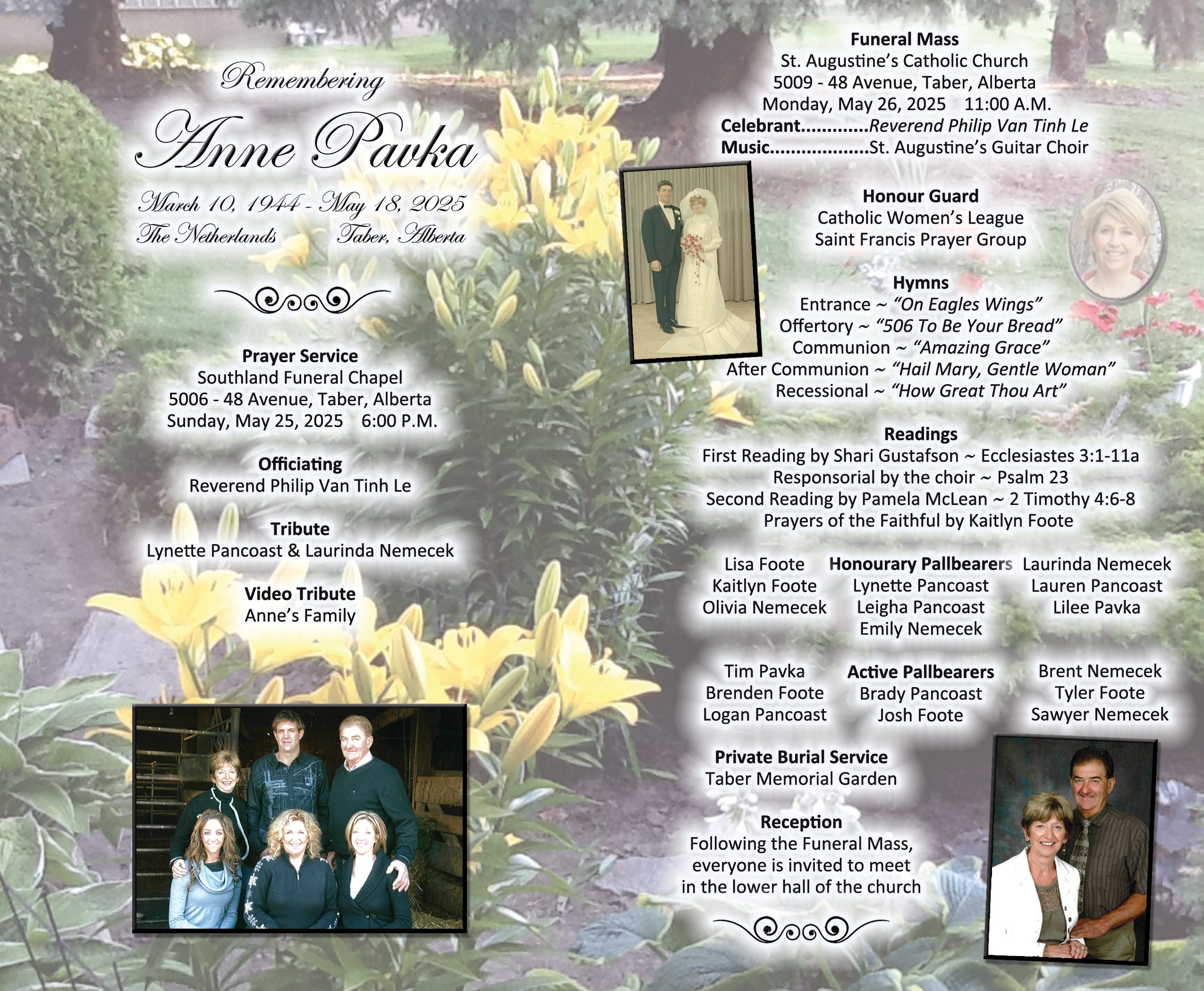 The Funeral Mass was celebrated at St. Augustine's Catholic Church, 5009 - 48 Avenue, Taber on Monday, May 26, 2025 at 11:00 A.M. Private burial followed at the Taber Memorial Garden.