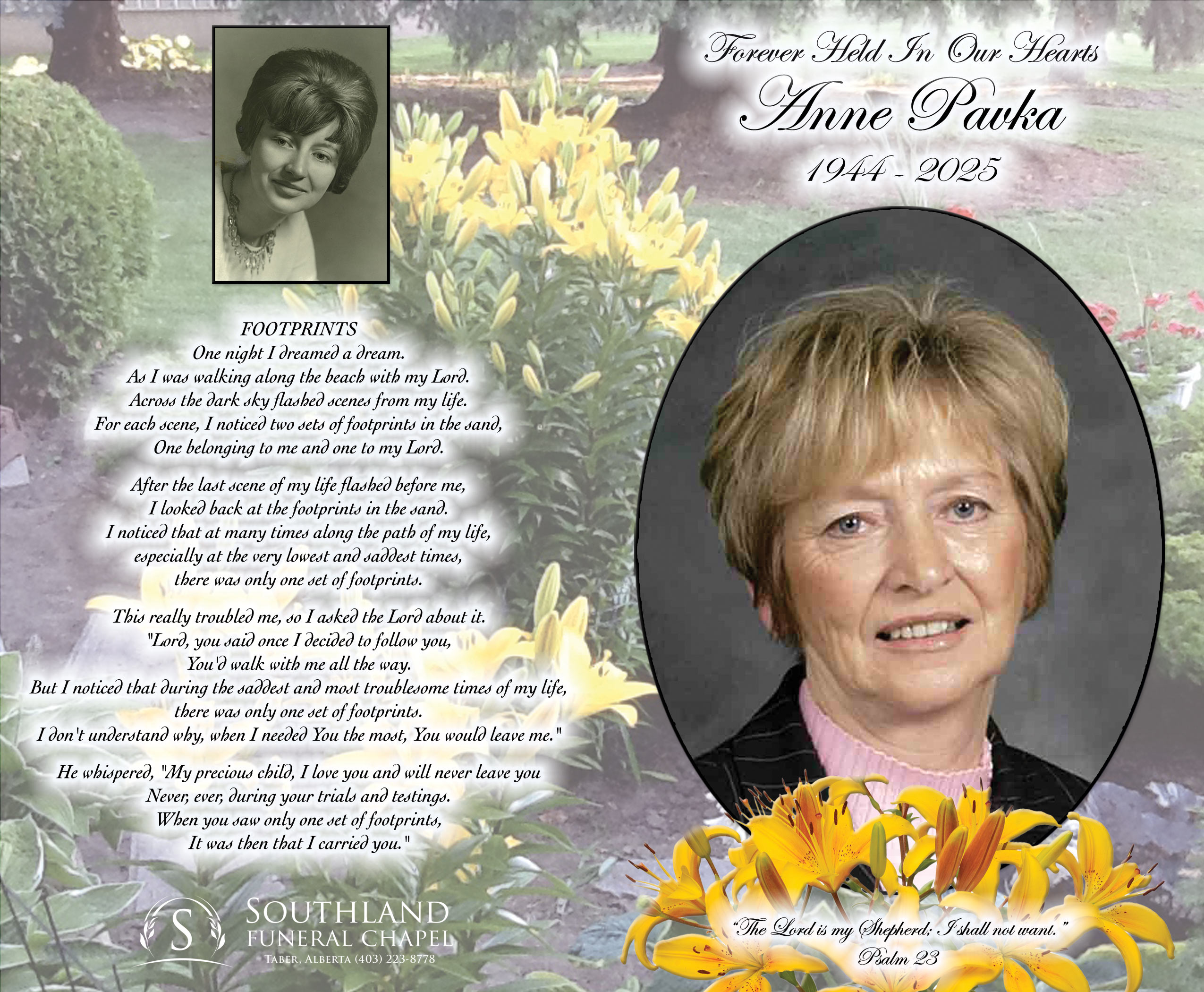Relatives and friends were invited to Prayers at Southland Funeral Chapel, 5006 - 48 Avenue, Taber on Sunday, May 25, 2025 at 6:00 P.M.