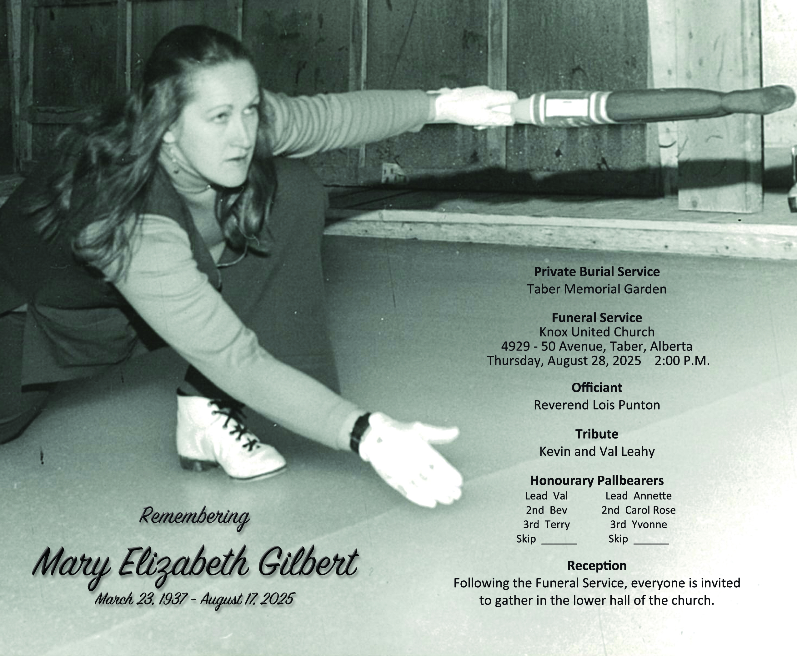 The Funeral Service was held at Knox United Church, 4929 - 50 Avenue, Taber on Thursday, August 28, 2025 at 2:00 P.M.