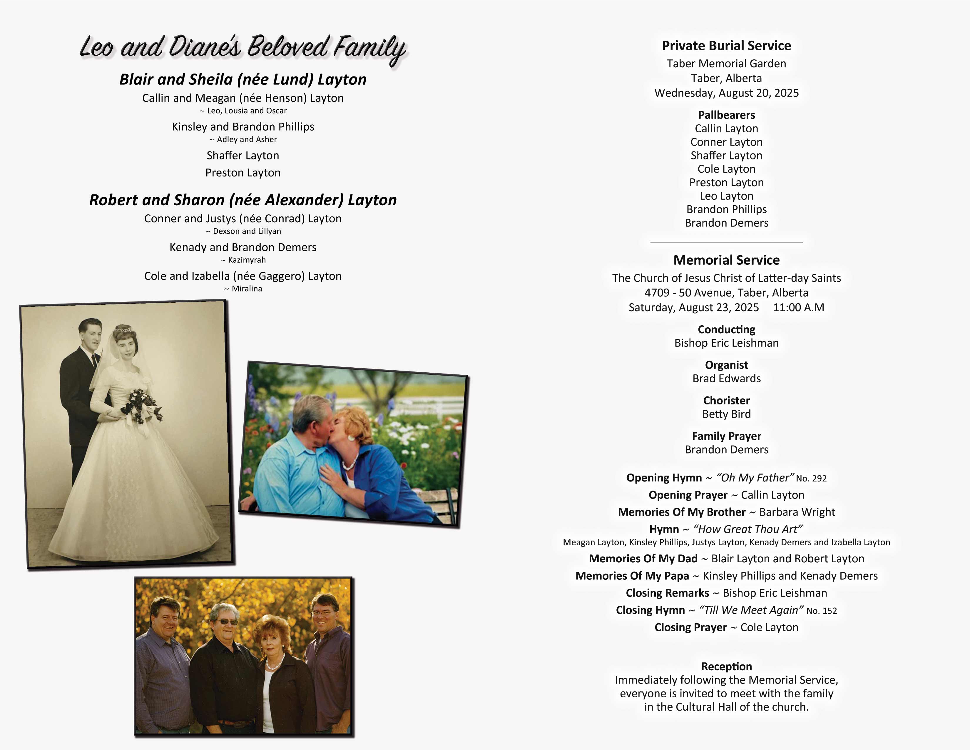The Funeral Service was held at The Church of Jesus Christ of Latter-day Saints, Taber Stake Centre, 4709 - 50 Avenue, on Saturday, August 23, 2025 at 11:00 A.M.