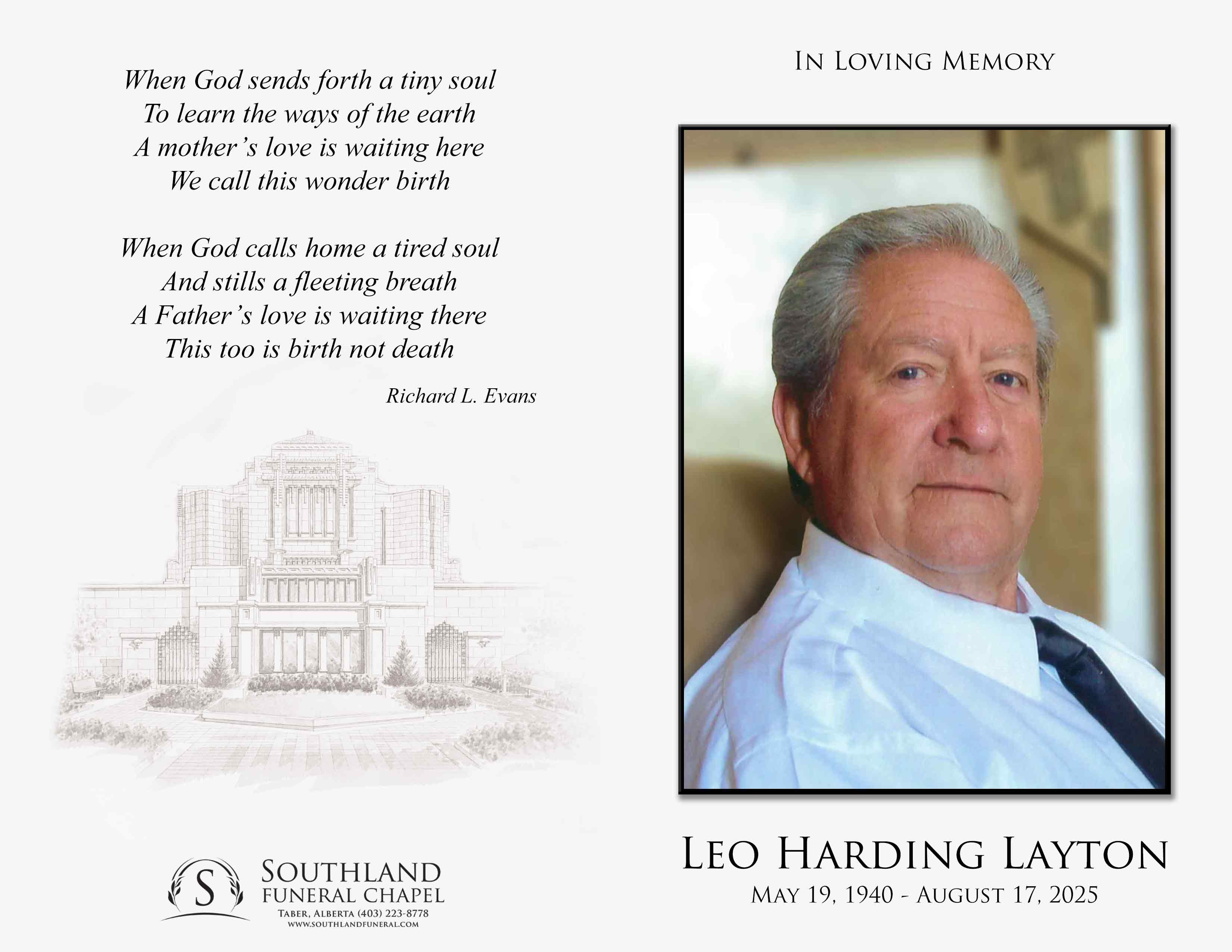 It is with profound sadness and great loss that we announce the passing of Leo Harding Layton in Taber on Sunday, August 17, 2025 at the age of 85 years.
