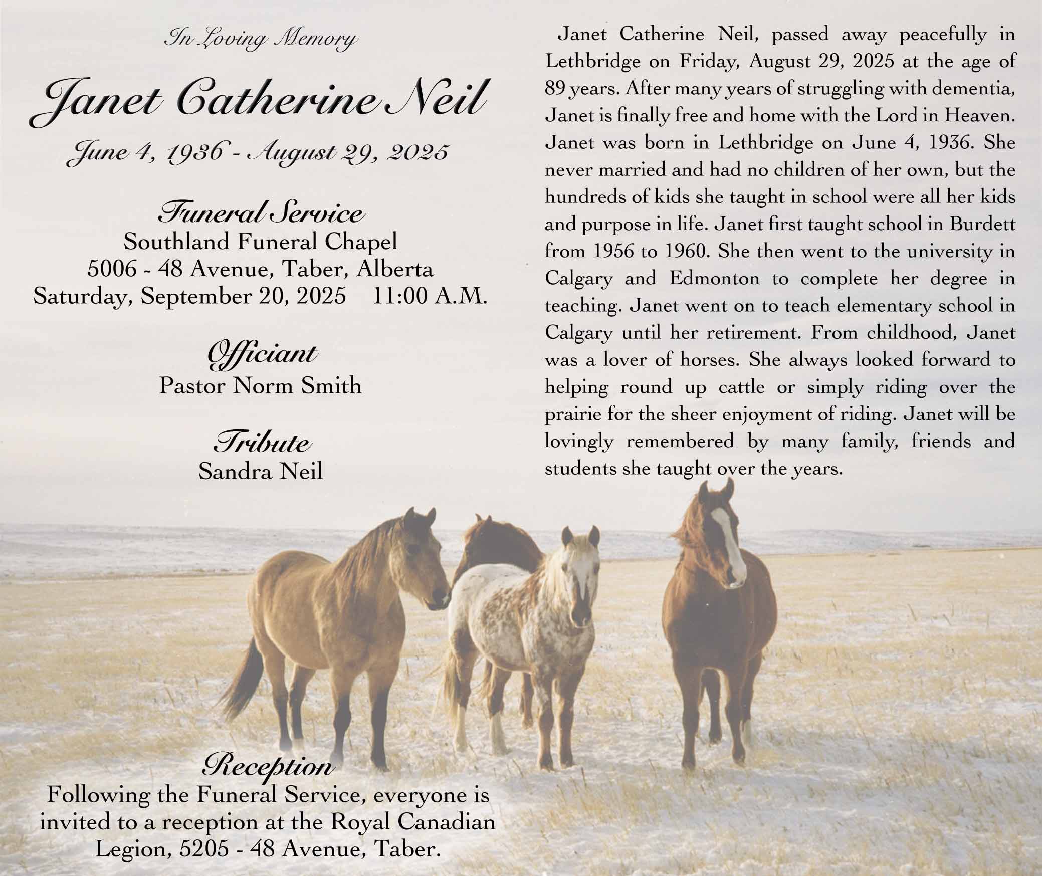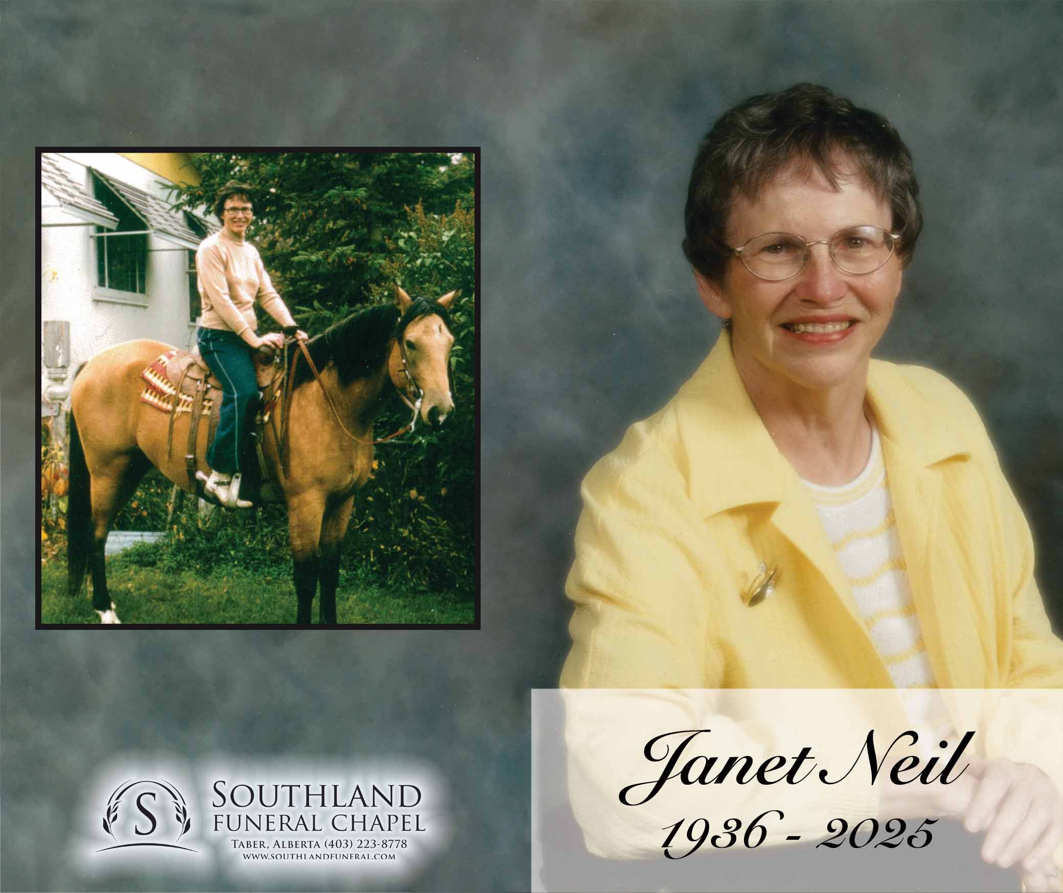 The Funeral Service was held at Southland Funeral Chapel, 5006 - 48 Avenue, Taber on Saturday, September 20, 2025 at 11:00 A.M.