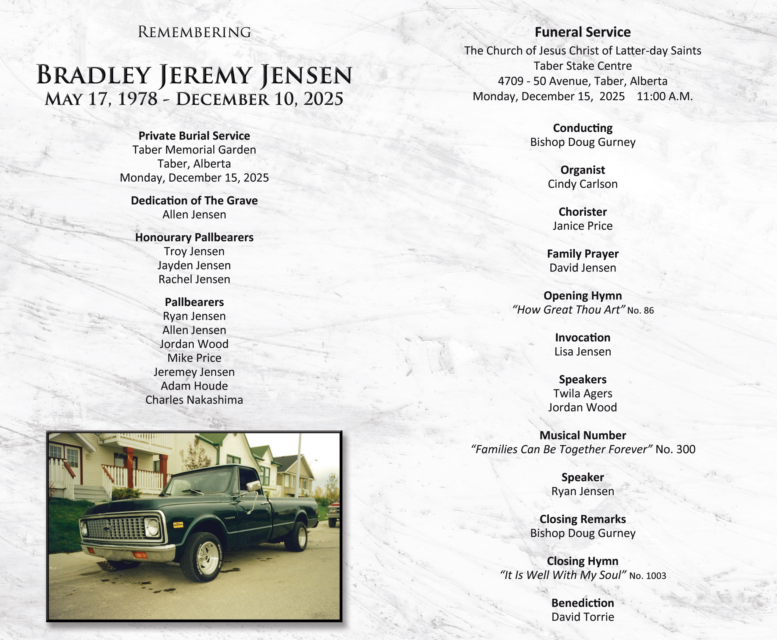 Bradley Jeremy Jensen, passed away in Lethbridge on Wednesday, December 10, 2025 at the age of 47 years.