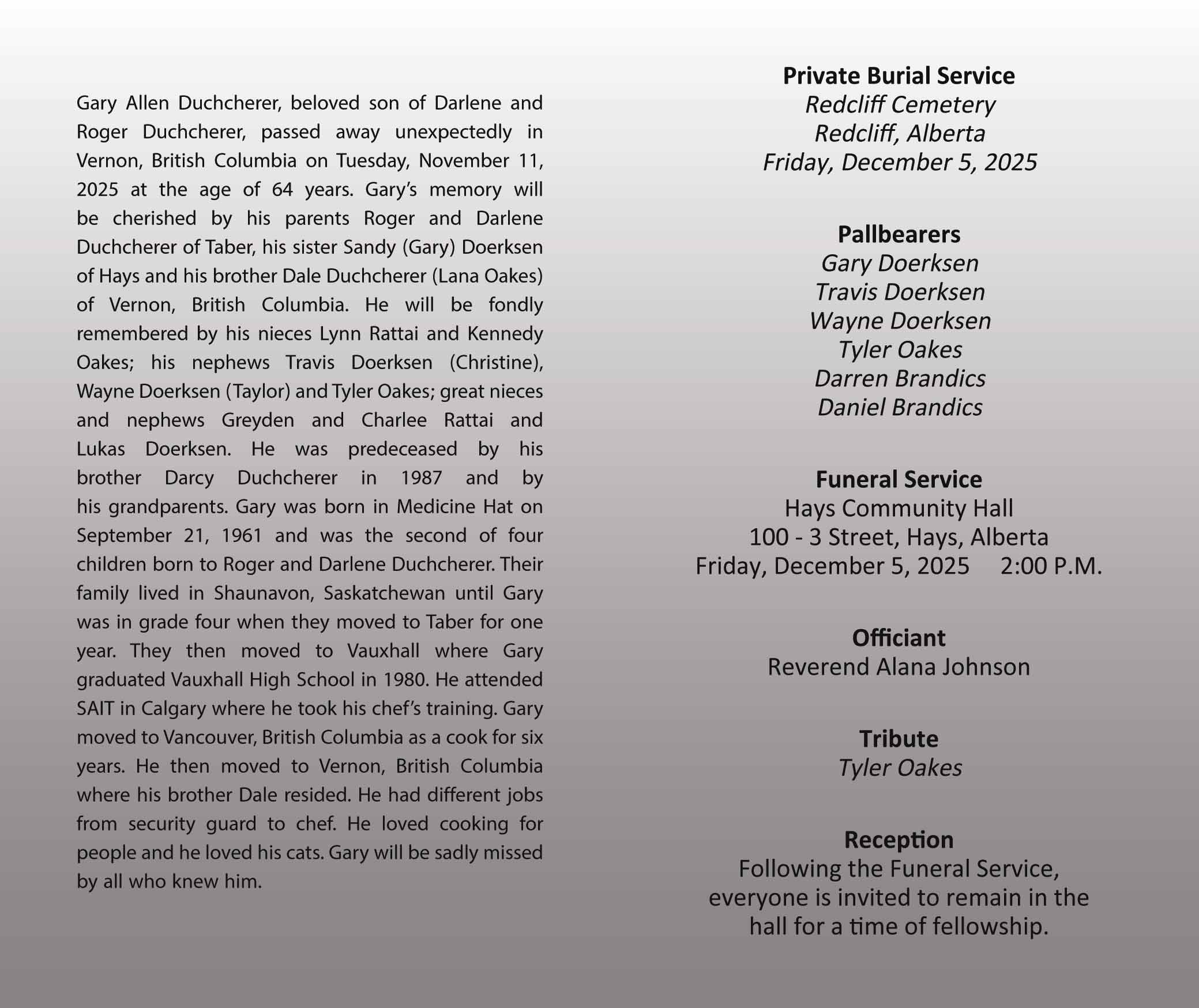 Gary Allen Duchcherer, beloved son of Darlene and Roger Duchcherer, passed away unexpectedly in Vernon, British Columbia on Tuesday, November 11, 2025 at the age of 64 years.