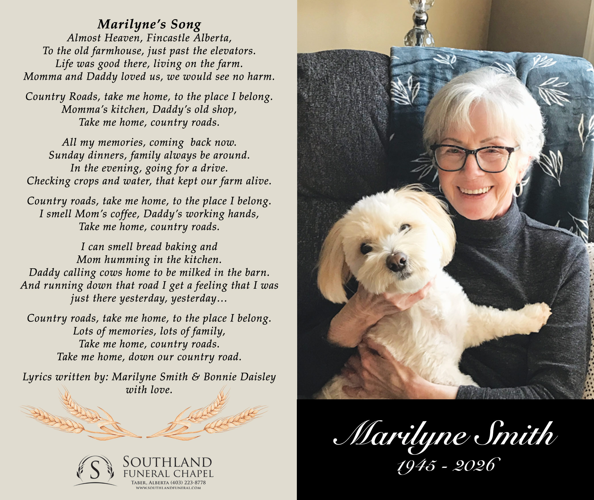 With deep love, we announce the passing of Marilyne Kathleen Smith in Taber on Tuesday, April 7, 2026 at the age of 80 years.