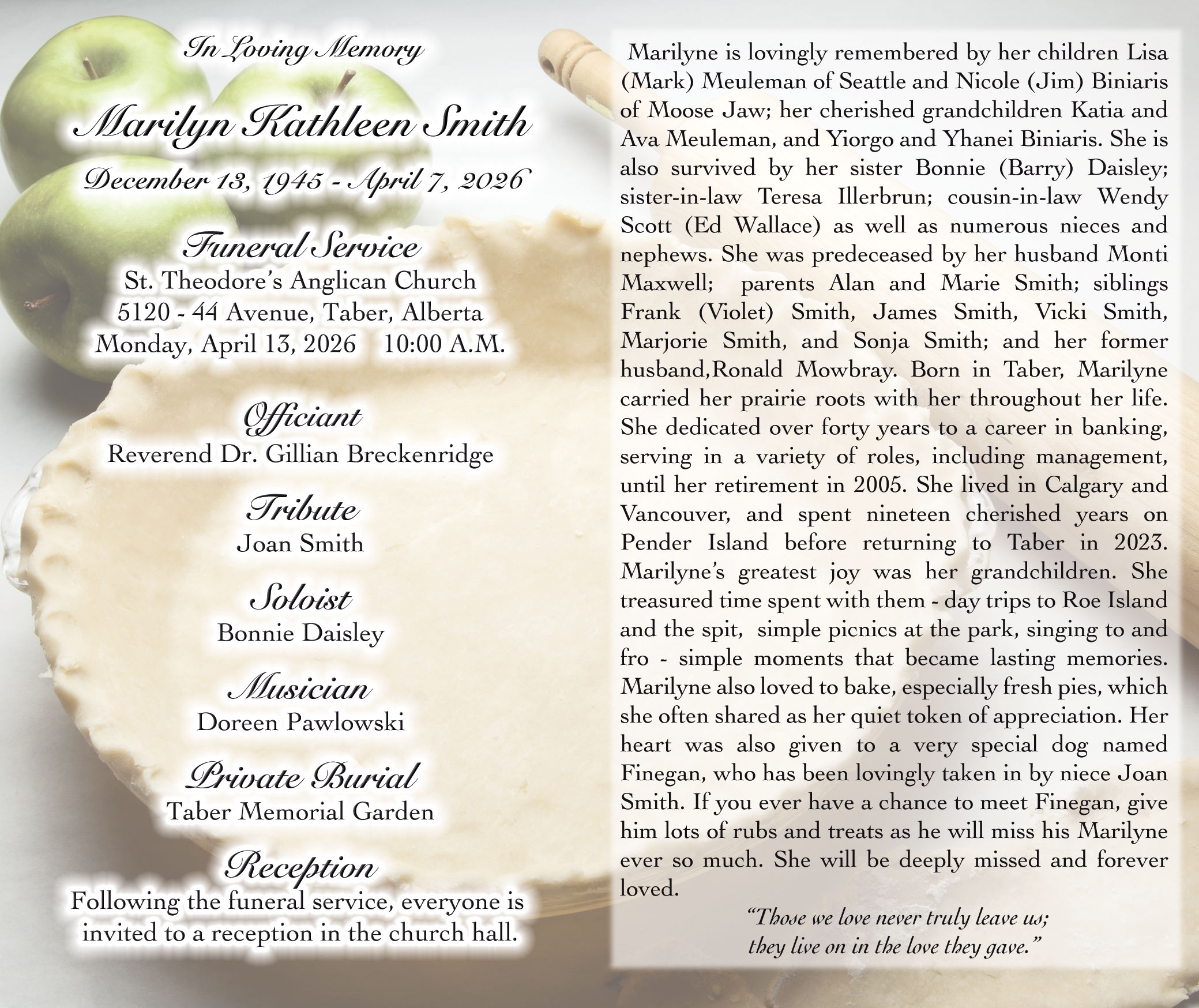 The Funeral Service was held at St. Theodore's Anglican Church, 5120 - 44 Avenue, Taber on Monday, April 13, 2026 at 10:00 A.M. A private burial will take place at the Taber Memorial Garden.